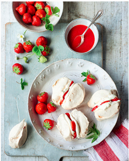 - Sandwich the meringues together using the cream and the sliced strawberries, serve the strawberry sauce on the side and scatter over the lemon verbena to make it look pretty.