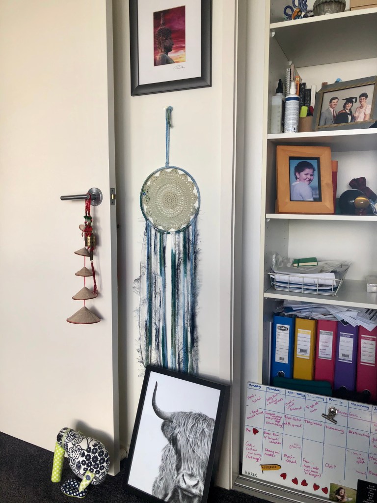 I also have some pen and ink pics – my fave is the music-listening fish. You can see it in the main pic. As a Pisces who listens to music all day, this represents me. Still to go up is the black and white Highland Cow Sarah bought me for Mother’s Day. It’s still resting by the door.