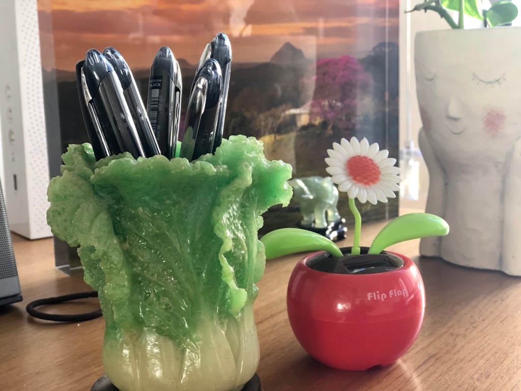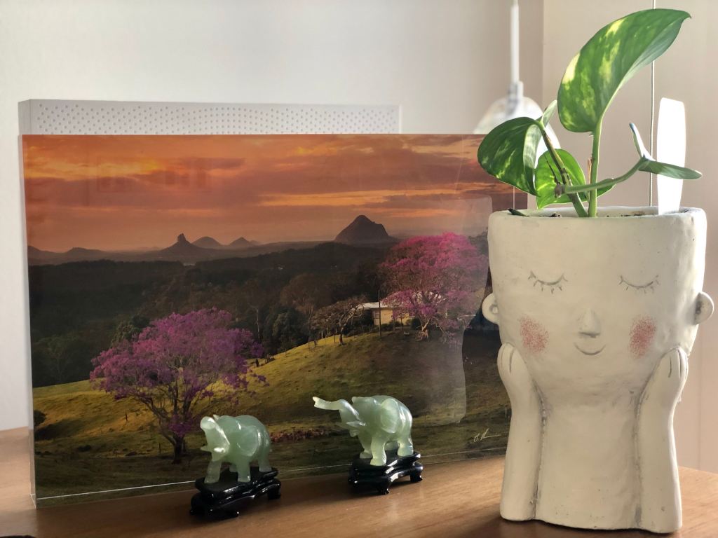 On my desk is a glass block photo of the Sunshine Coast hinterland near Maleny and the ceremonial bok choy that my boss brought me back from Malaysia one time – it’s supposed to be lucky or something, and in case it actually is lucky I haven’t been able to bring myself to get rid of it. Besides, I rather like its kitsch.