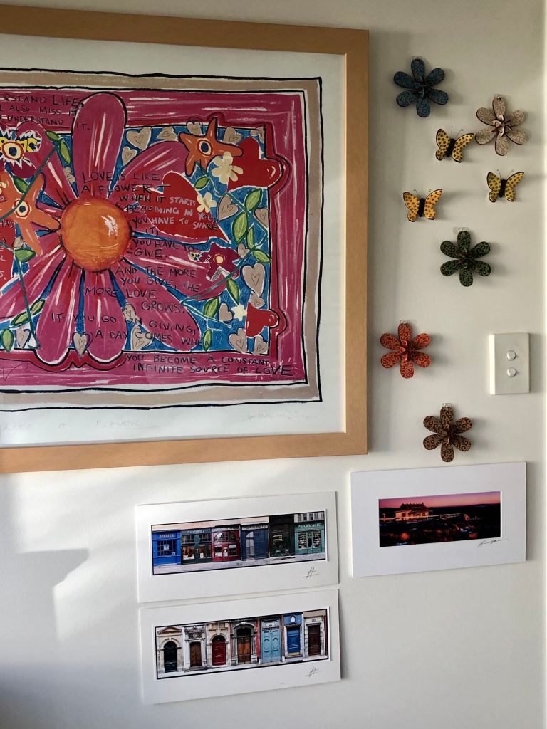 Also on the wall is a huge daisy picture by Garry McEwan about love. I’ve had it for years and look at it when I have the gloom and dooms and my creativity has got up and gone. To me, it says creativity and love. It also says: