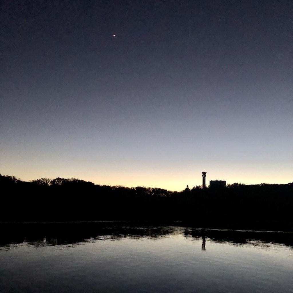 On the water the kayakers are wearing head-lamps so in the pitch dark the lights look like they’re scooting across the surface of the water, like big fireflies. Now, how’s that for a romantic picture at 5.30 in the morning?