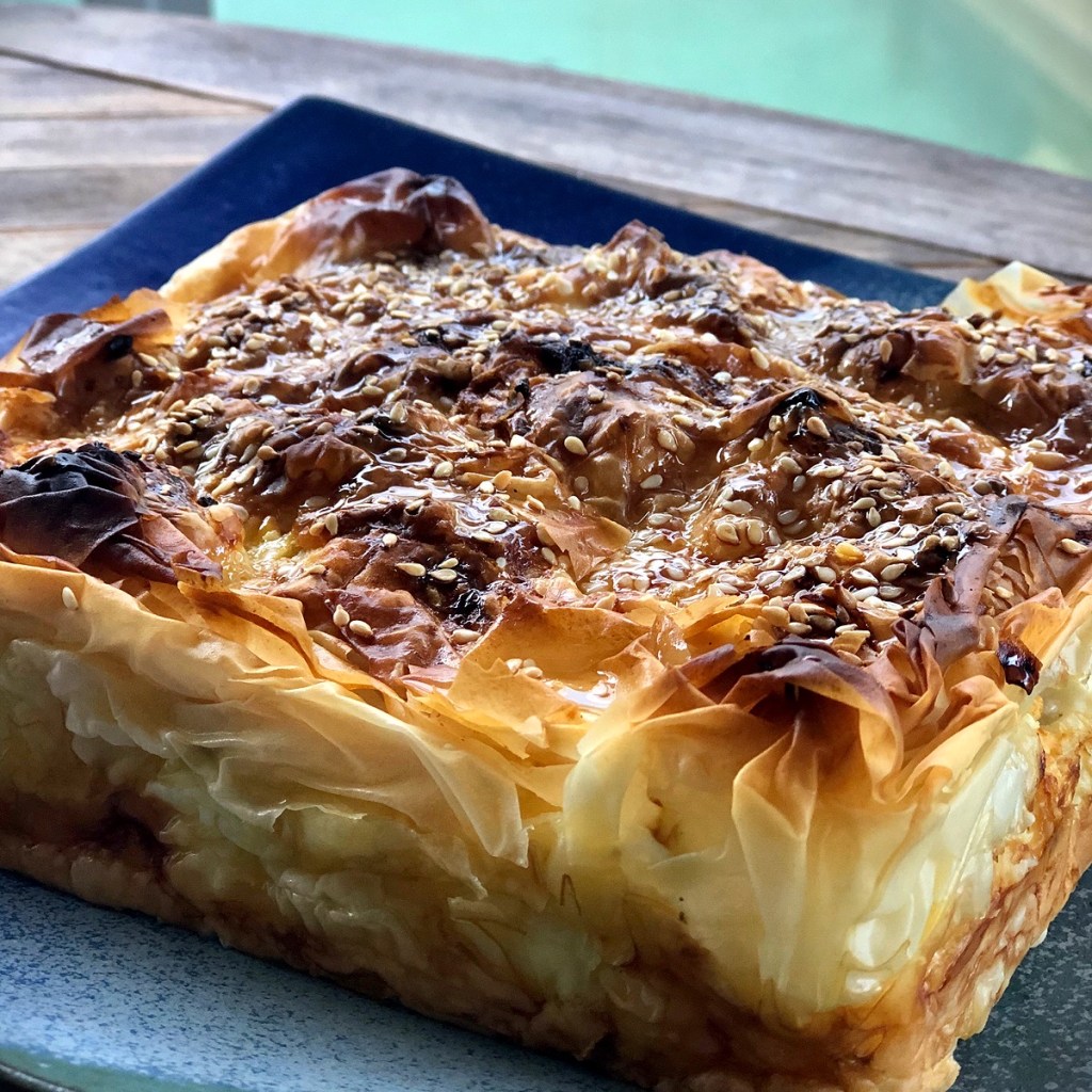 This is a salty-sweet version (think Greek cheesecake) of the Greek Patsavouropita, created by bakeries as a way of using up old scraps of filo pastry: the ”old rags” indicated by the title. They’d just go along their counters, collect up all the bits and turn them into this pie.