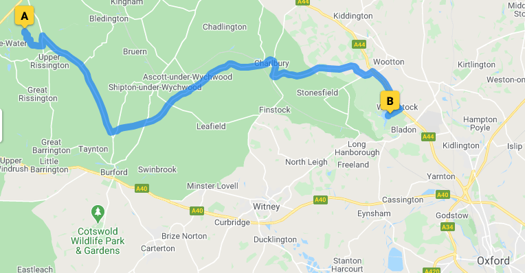 Blenheim Palace is located in Woodstock, about 10 miles north west of Oxford and about 60 miles (around a 90 minute drive) north west of London.
