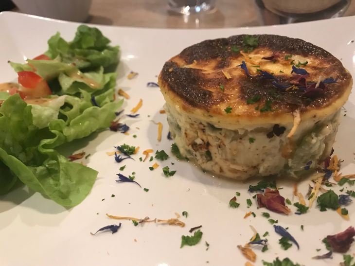 We ended up sharing two boards between the three of us. On each board were a skewer of boudin blanc (white pudding), skewers of smoked salmon, another of zucchini and peppers, a slice of pate en croute – pate in a puff pastry crust – baguette and brie, and thin slices of a local raspberry sabayon cake.