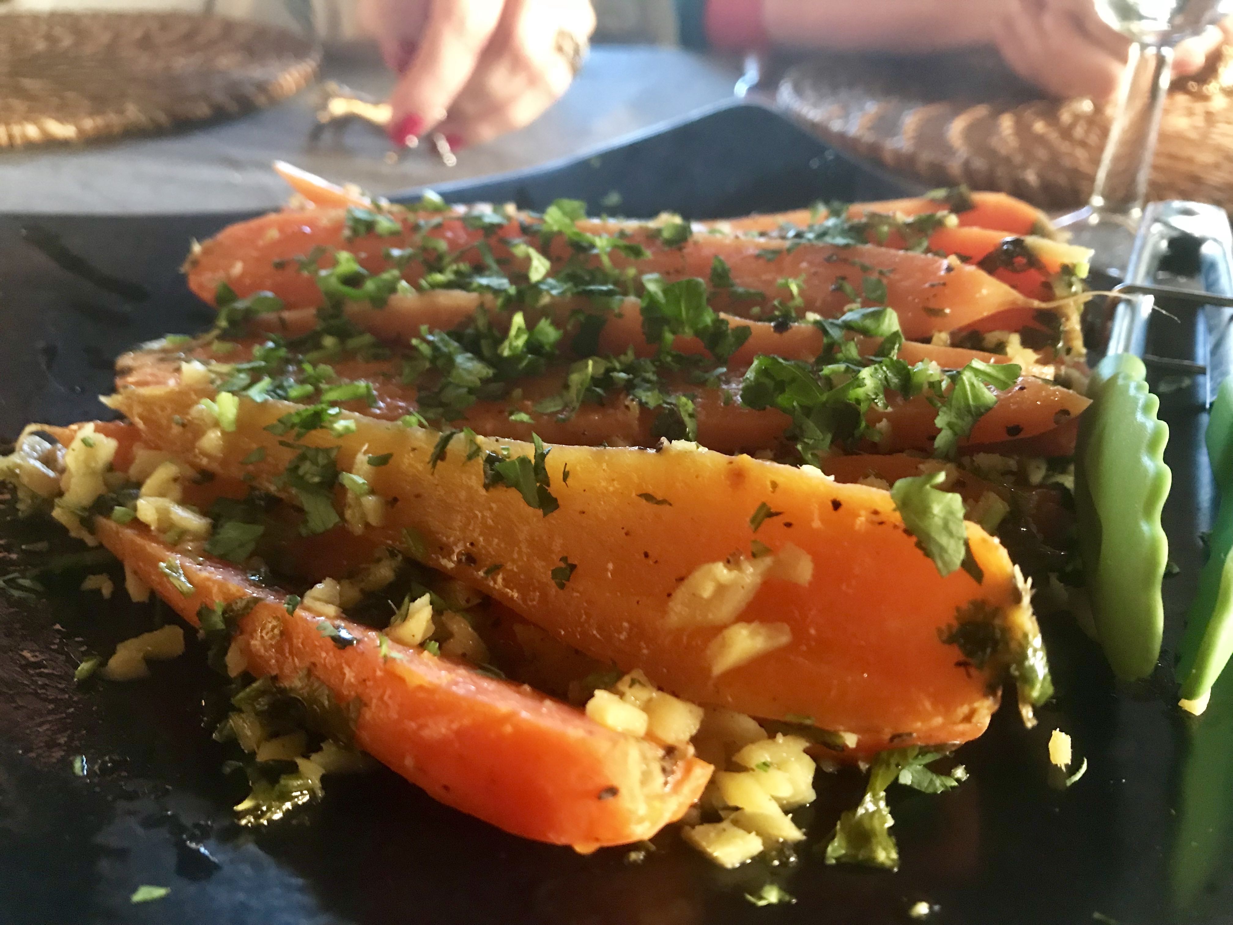 Mike and Glenis joined us for our main course – served platter style. There was a Moroccan style lamb surrounded by broccoli and peppers spiced with chilli, bowls of oil-brushed potatoes roasted in their skins, carrots glazed in ginger and coriander, and a celery, walnut and cauliflower salad with pomegranate molasses dressing.