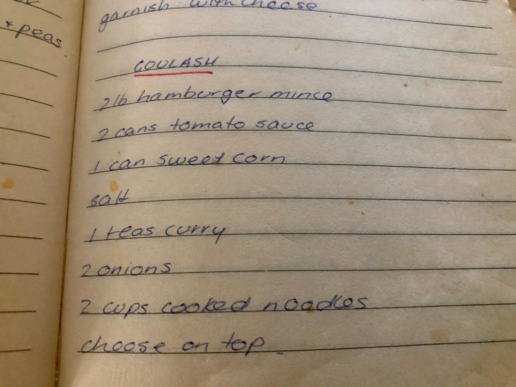 While I haven’t cooked it in years, I have the recipe written down in the little book I wrote recipes in before I left home. My handwriting at 20 was much neater than it is today and while I’ve written down the ingredients, I’ve not bothered so much with the method.