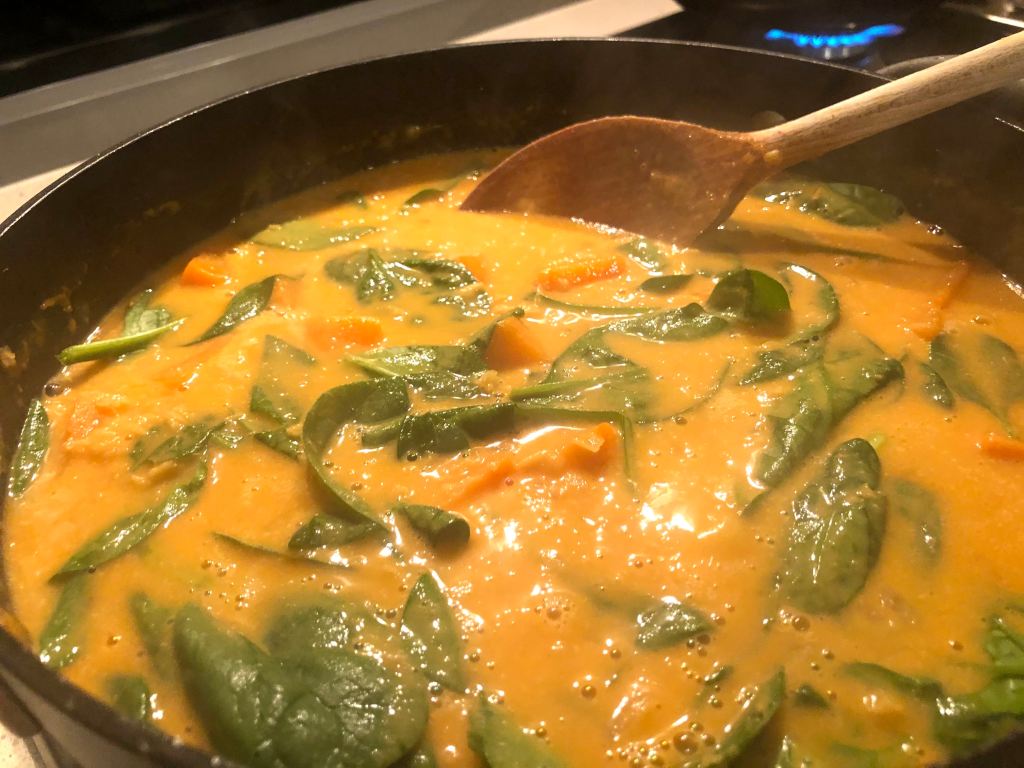 - Stir in the coconut milk, spinach and lime juice. Check seasoning and adjust with fish sauce in need, and cook for 5 minutes. If you’re using it, stir in the sambal now.