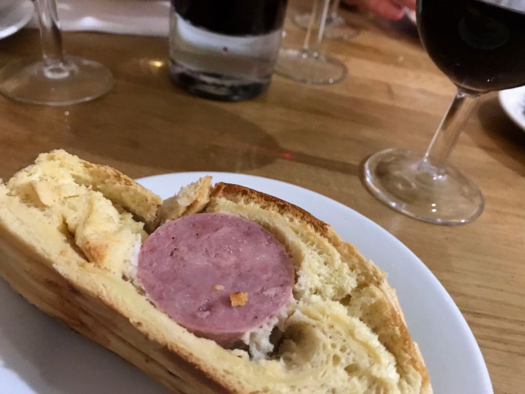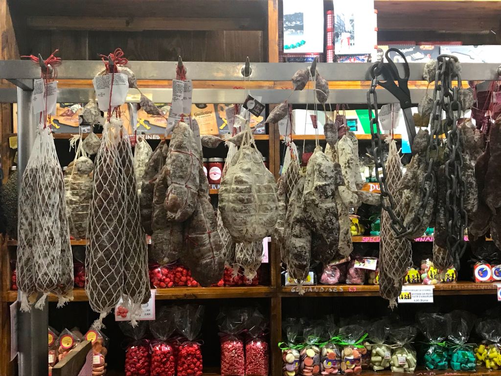 We tried chaud saucisson en brochette, an assortment of salamis whose names I didn’t write down, andouilette (tripe sausage) mixed with creme fraiche and spread onto bread (bottom wight pic) and not at all like the biology lesson it was when hubby tried it the day before in Saint-Gengoux-Le-National. Having said that, I still didn’t like it. Apparently, the Lyonnaise use veal “bits” rather than pork “bits” so it’s not as stinky…whatevs. The red wine took the taste away nicely.