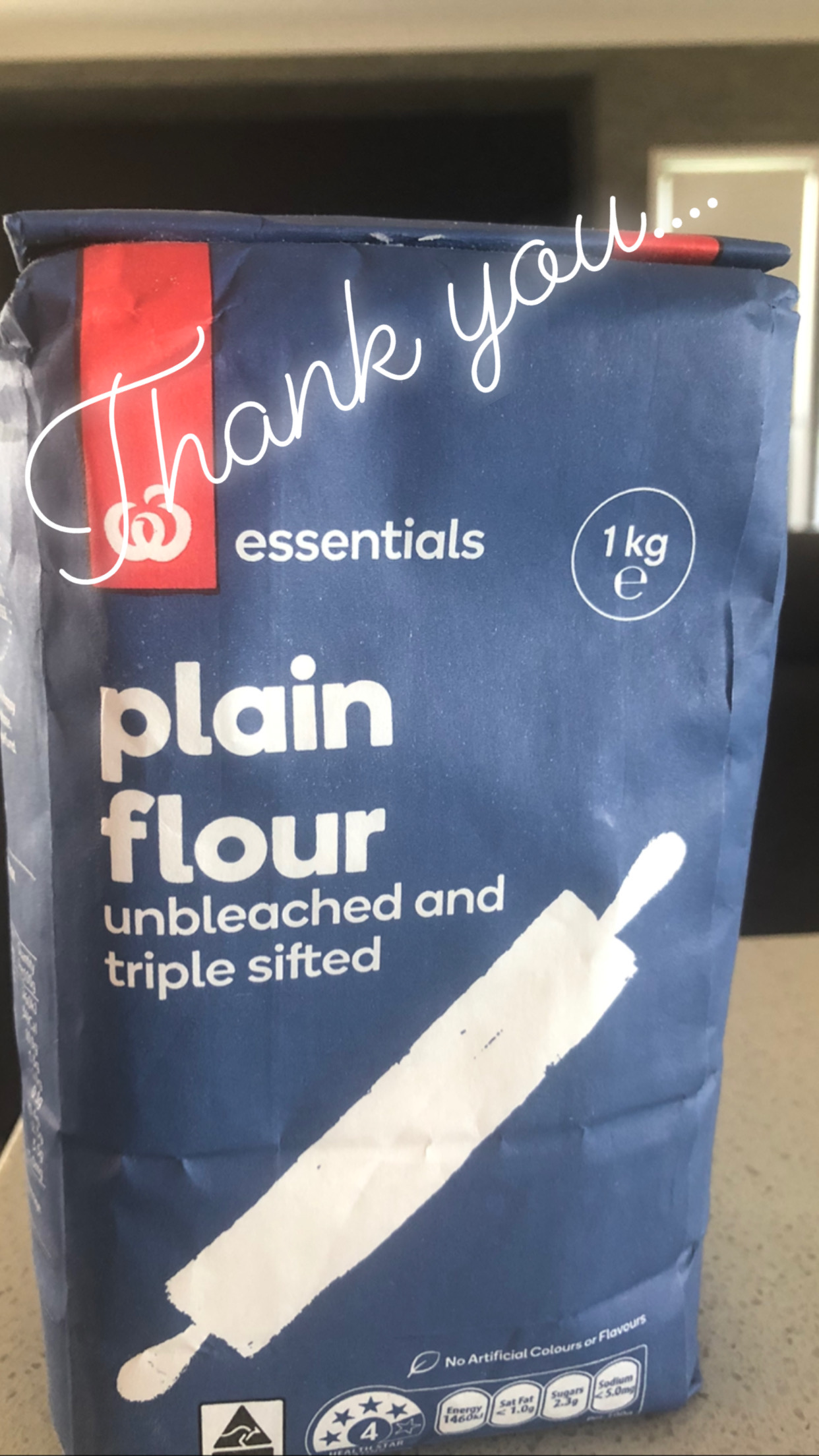 After mentioning on a day job teleconference that I hadn’t been able to source plain flour, I was surprised by the arrival of a covid survival box in the mail. It contained: a roll of toilet paper, some sanitising wipes, a bottle of hand sanitiser, a bottle of wine and (joy of all joys) a bag of plain flour.