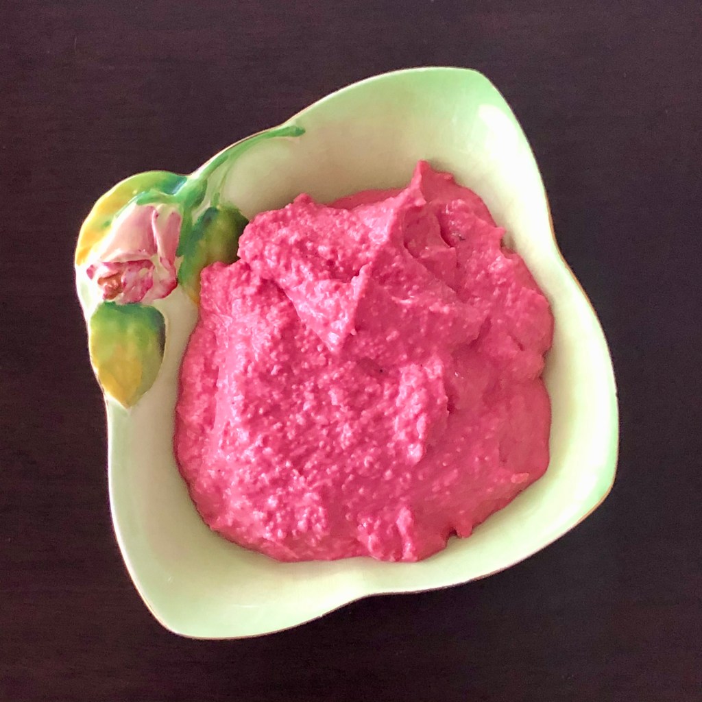 The color of your hoummos (which I think is our humus) is much more appetizing than that of chickpeas. Have never had a beet…is that the same as a beetroot? Well, I take that back…only in Panamanian potato salad. Great tip to use ice cubes in the blending. I am sure this is delicious.