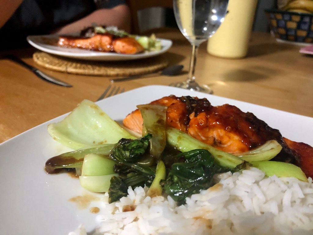 Tonight, we’re having oven-roasted salmon fillets with Thai chilli sauce and salad. It’s super quick to make – the salmon takes as long to cook as the rice does – and is tasty as. The salmon is cooked in a sauce made from sweet chilli sauce, chilli jam, soy sauce, ginger and garlic. We have it with some boiled rice and Asian greens which I stir-fried in a little sesame oil and some more fresh ginger and just a touch of oyster sauce. It’s one of Sarah’s favourites. And yes, that is mineral water in my wine glass.