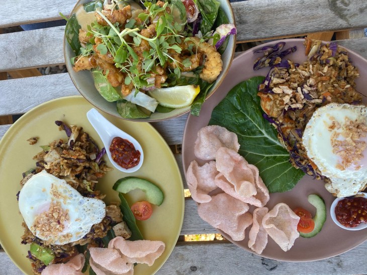 The eggs are actually on nasi goreng. It’s an Indonesian dish that’s often eaten at breakfast, but in this case was lunch. There are a number of south east Asian dishes that are served with an egg on top.