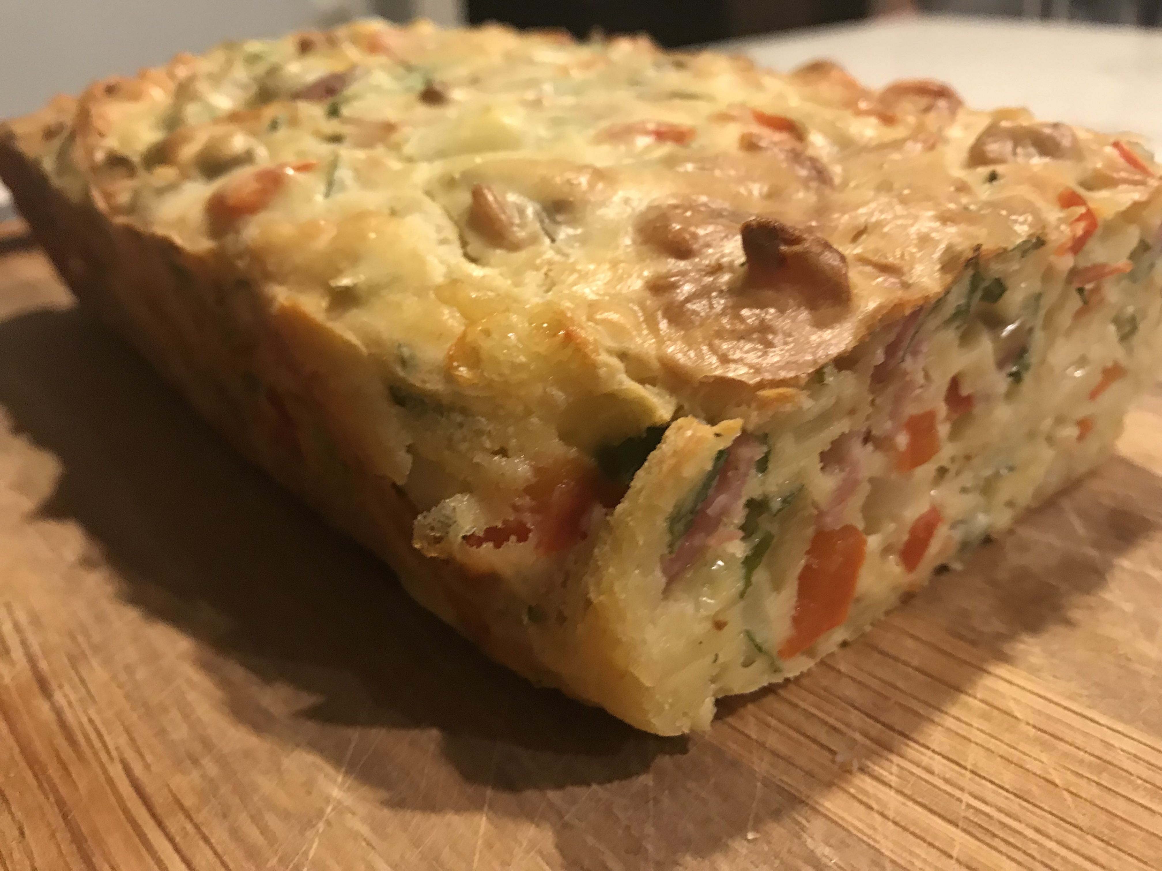 Although she was kind enough to send me the recipe, at its heart this cake (which is a cross between a frittata and a crustless quiche) is a very clever use of leftovers rather than prescribed ingredients. What goes in it are leftover vegetables, herbs, cheeses, maybe a little bacon – whatever you happen to have in the fridge. The eggs, yoghurt, oil and flour are there to bind it all together, but every loaf is just a little different.