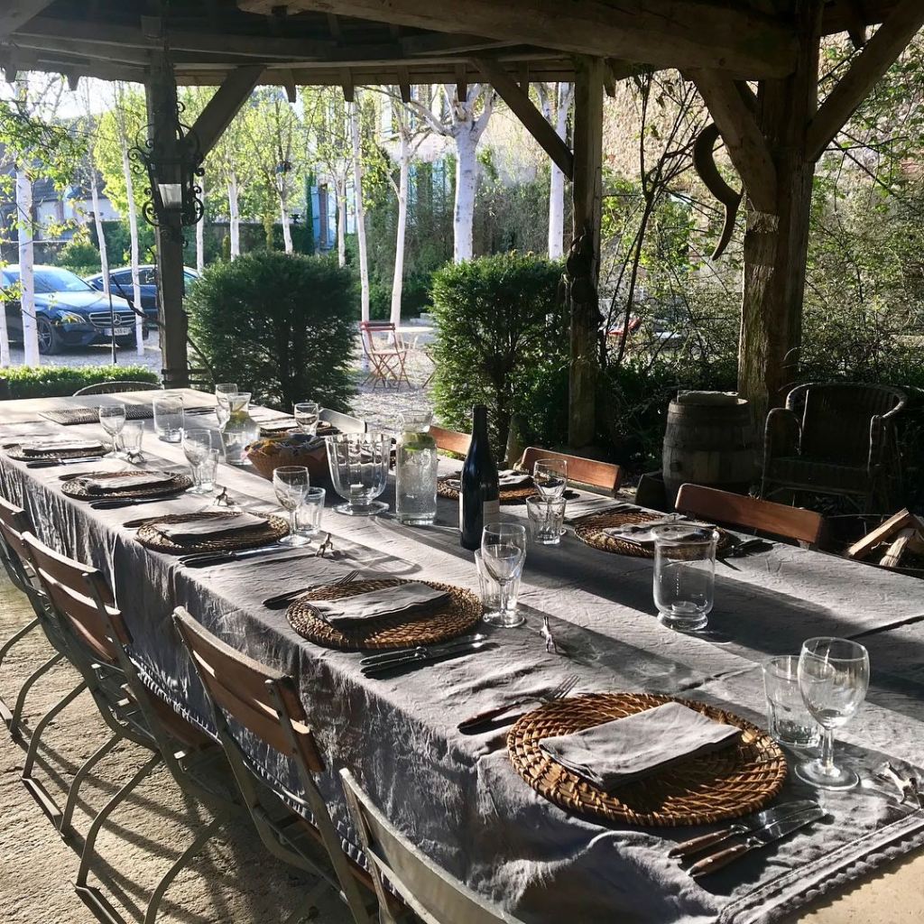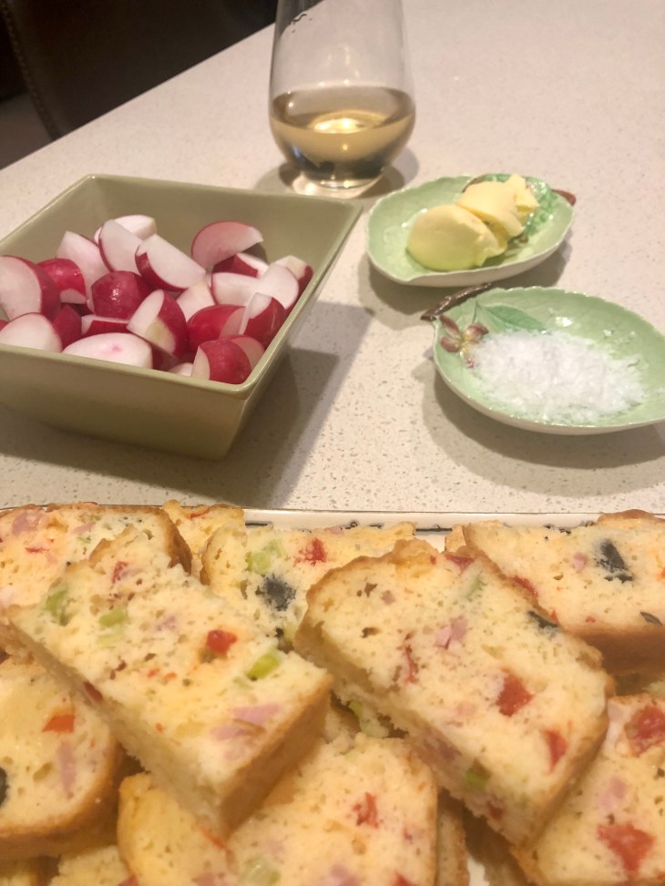 Take this savoury cake for example. Glenis at Aupres de l’Eglise in Oyes (main pic) served it as an aperitif with champagne in the courtyard before dinner. Also served were radishes – the long French breakfast style that we have difficulty sourcing here – with amazing butter and salt. We ate it in the courtyard under the birches on a sunny spring evening. It was everything I’d dreamed of and more.