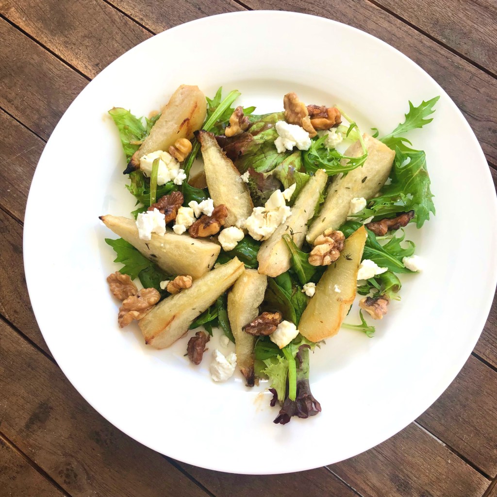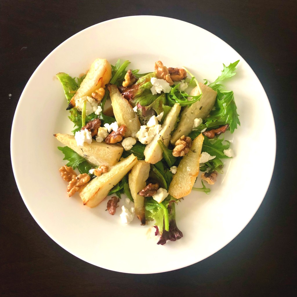 - To serve, toss the salad leaves with the dressing. Put on a platter and top with the pear, goat’s cheese and walnuts (or arrange in the baking tray). This is best served warm.