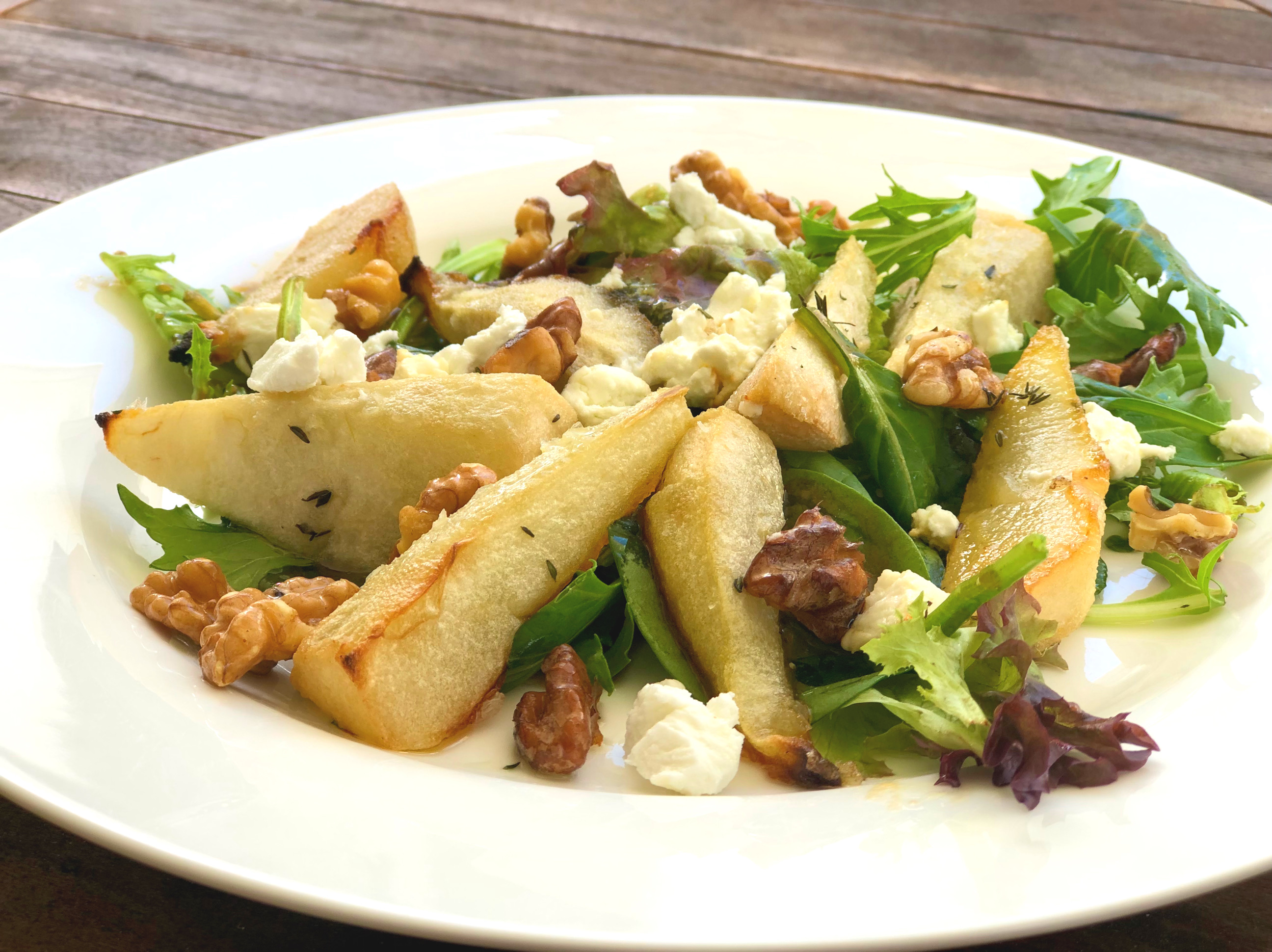 This recipe calls for the walnuts to be toasted in the oven. After taking a work call and having them burn, I did mine in a small frypan where I could keep a good eye on them – even with my phone to my ear. It is, however, your call. Also, instead of using a goat’s cheese “log” I used a soft goats curd and added it to the tray of pear and thyme with 10 minutes cooking time to go. I couldn’t get radicchio, but picked some mixed leaves from the lettuce I’m growing. The message? Work with what you’ve got.