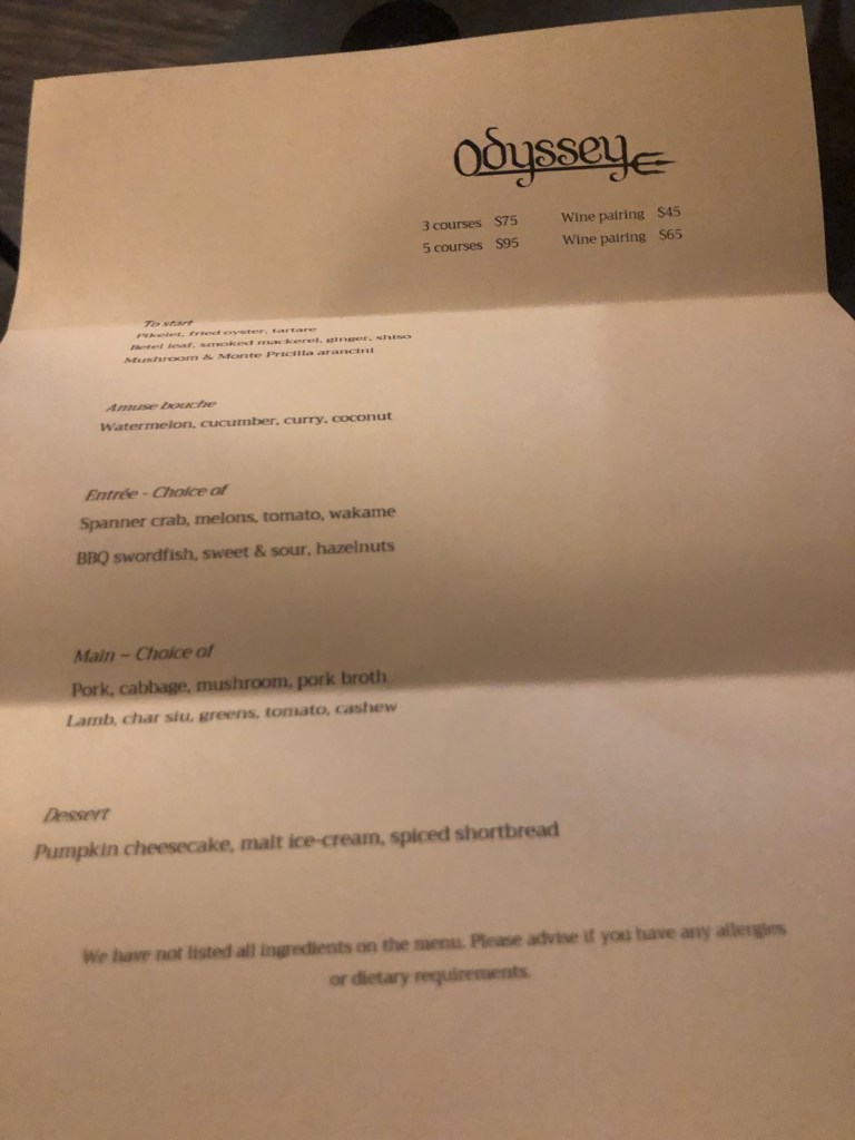 This was without a doubt a memorable meal from start to finish. Odyssey is a casual fine diner (fine dining without the pretension or need to get too glammed up) that is all about local produce – from Caloundra on the Sunny Coast, through the Hinterland and up to Bundaberg. The key staff take it in turns to do the produce run each Monday, the menus for the week are written and tested on Tuesday and served from Wednesday.