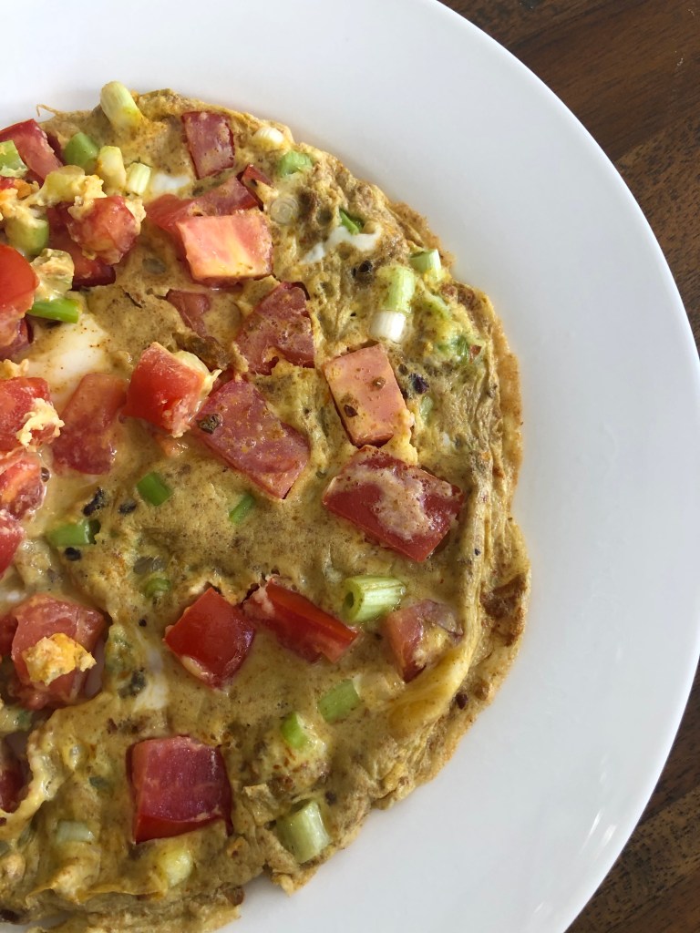 The thing is, while I love omelettes, I’m not great at making them – other than the type that you don’t fold but rather finish off under the grill, like Nigella’s masala omelette – my omelettes tend to turn into a scramble instead. (As an aside, while it doesn’t look very pretty, this is a super quick, tasty and healthy lunch. Serve with a dollop of Greek yoghurt.)