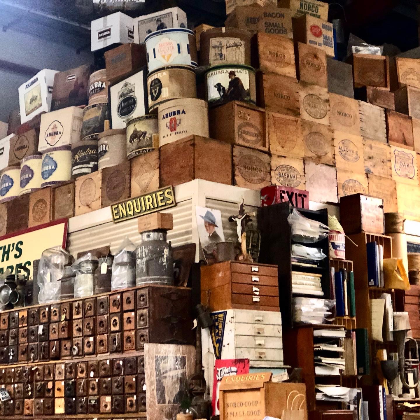 Behind the counter is a veritable mountain of Akubra hat boxes under which are Singer sewing machine drawers.