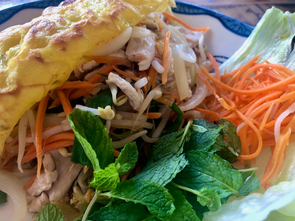 We stopped for lunch at a Vietnamese café on Marine Parade. Grant had a Hue-style spicy pho or noodle soup, and I went for the Vietnamese pancake – or Bánh xèo. Made from rice flour, water and turmeric powder it’s stuffed full of veg and herbs with (in this case) a little chicken.
