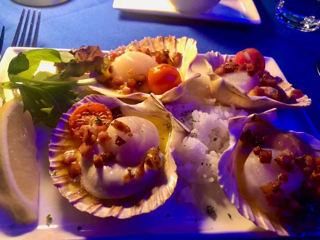 For dinner on Saturday night we wandered into Kingscliff. I’d been told that the Taverna was one of the best places to eat, but I’d left it too late to book. Instead, we ate outside at Unicorn. A Med-style seafood restaurant it reminded us so much of Plaka and Con’s in Canberra from back in the days when we were dating – and the food was good and of the sort that never really goes out of style. I started with scallops, Grant with garlic prawns, and we both went for the whole sole for our main. Simply cooked, while it’s a palaver to eat, the sole was sweet and delicate and a real treat – despite the weird blue light over everything.