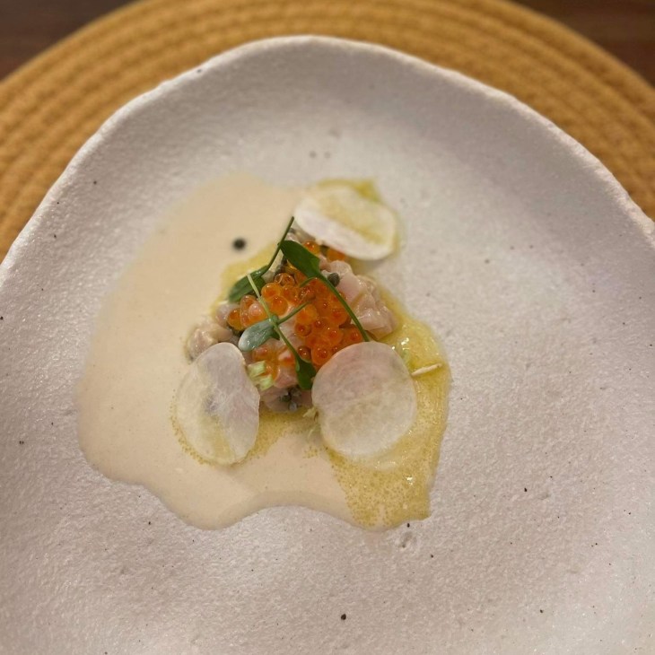 Second course: Kingfish sashimi, cara cara orange, hakurei (turnips), coconut