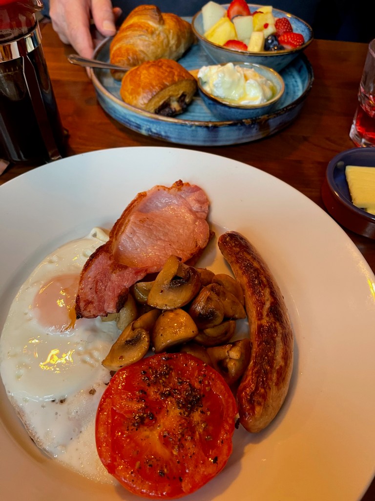 With few exceptions, we haven’t really been eating brekky as such this trip, but as this was a B&B we’re offered the full English this morning – served at the pub, The Manners. It’s nice for a change and I’m very happy to see my egg served on half a Derbyshire oatcake. I’m even happier to know that the ones I made (see this post) tasted pretty similar. Well chuffed, I am.