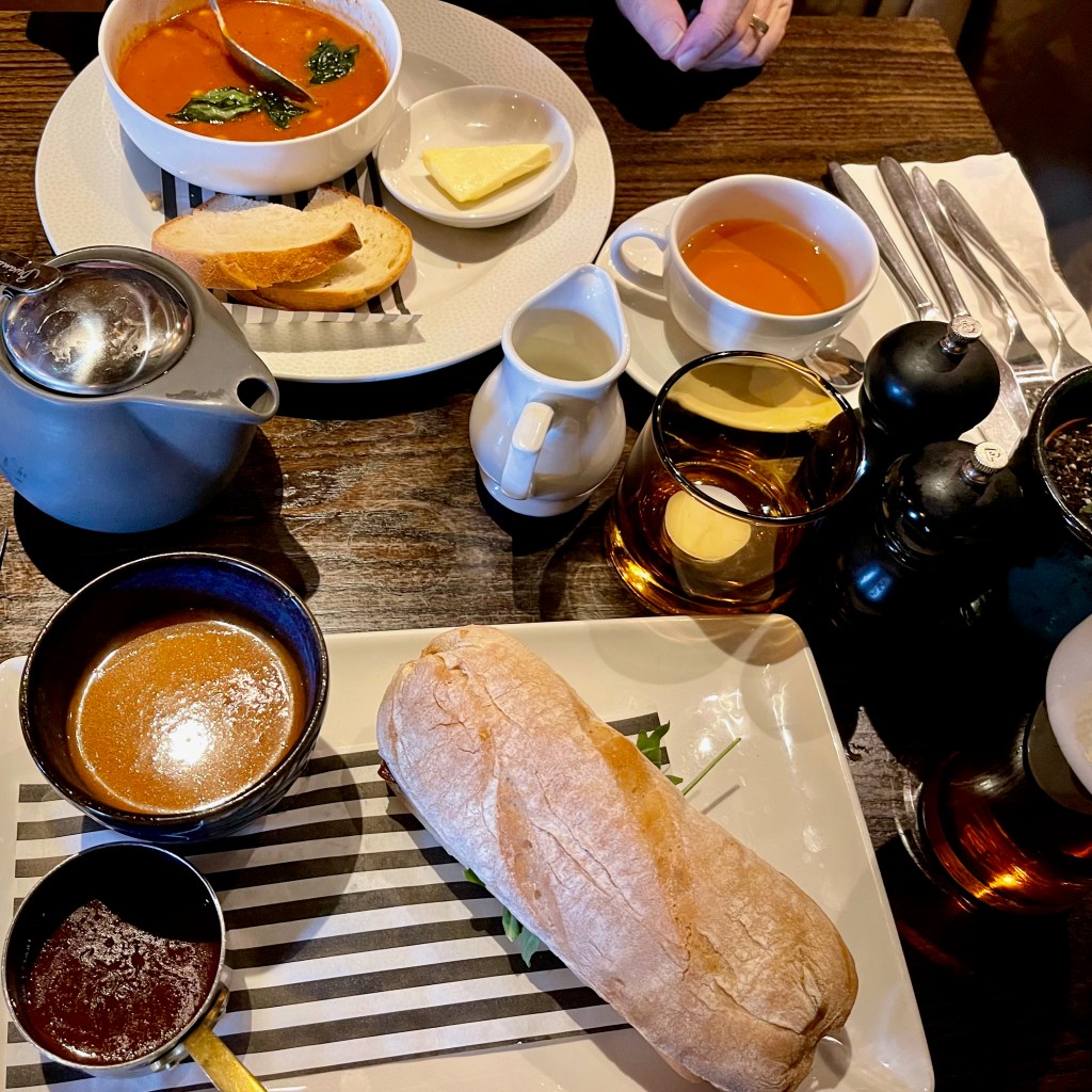 The Boot Inn is a gastro pub with a great menu and fabulous decor. It’s also very busy considering it was Wednesday lunchtime. Tomato soup (again) and a shared steak sandwich.