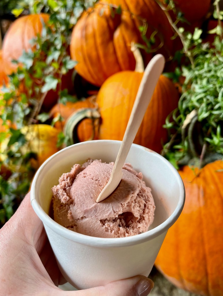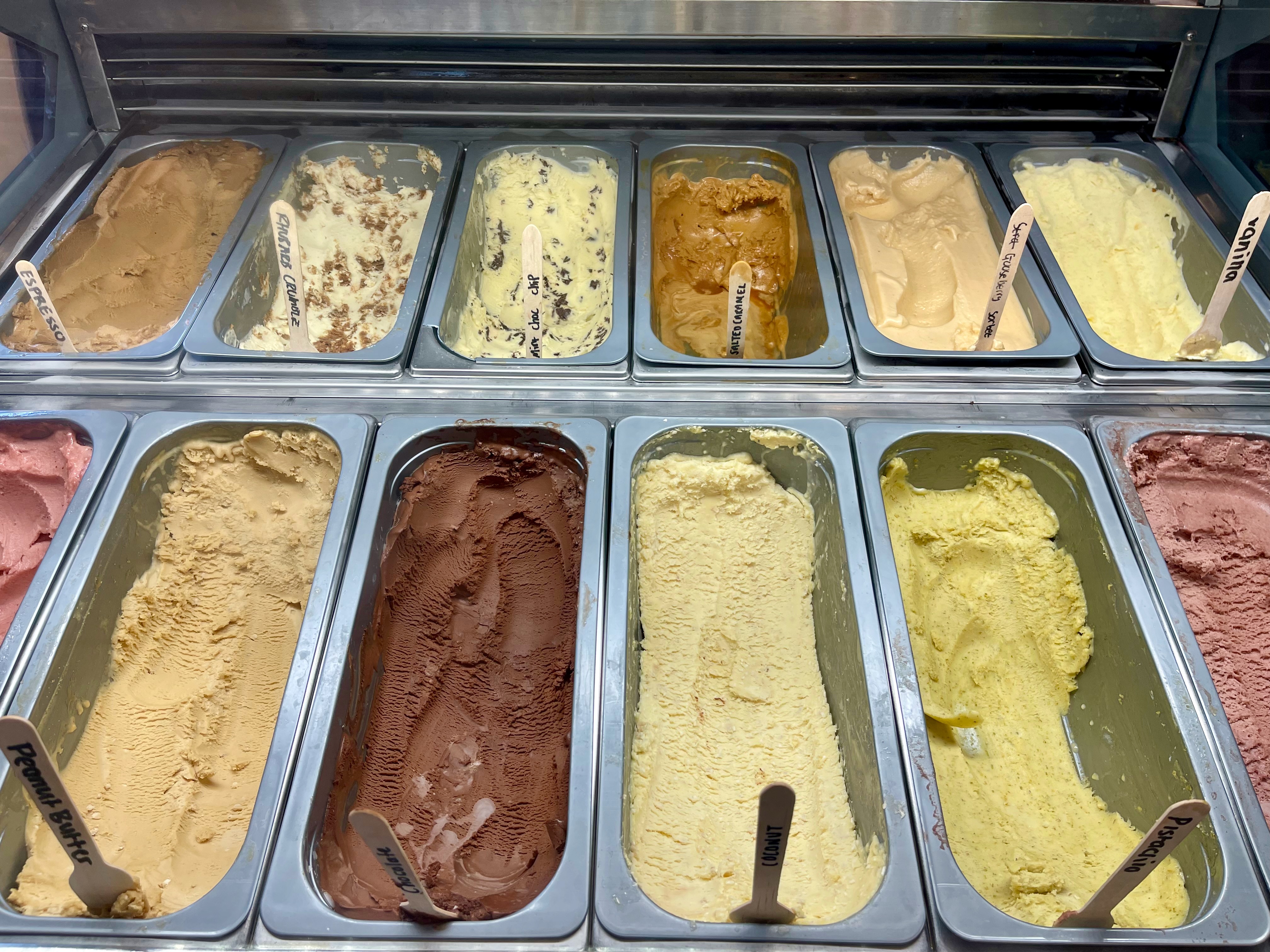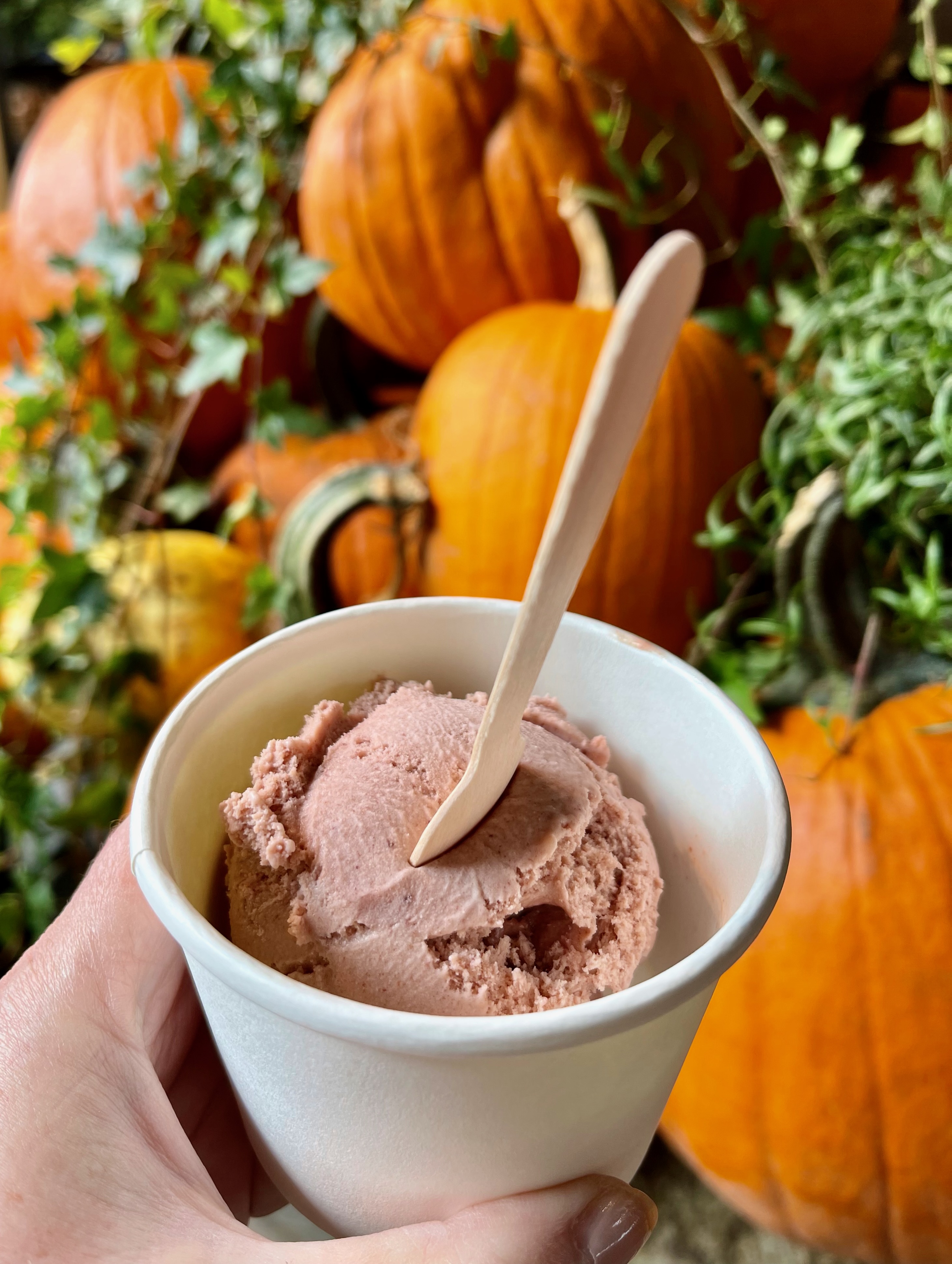 We have one final stop before reaching Tetbury – at our old fave Jolly Nice Farmshop at Frampton Mansell. It’s a place that, back in 2015, inspired my book Wish You Were Here. Since we were last here just before Christmas in 2019 they’ve expanded again – also adding drive-through for covid. One thing that hasn’t changed is their ice creams. We share a scoop of damson; it’s tart and delicious.