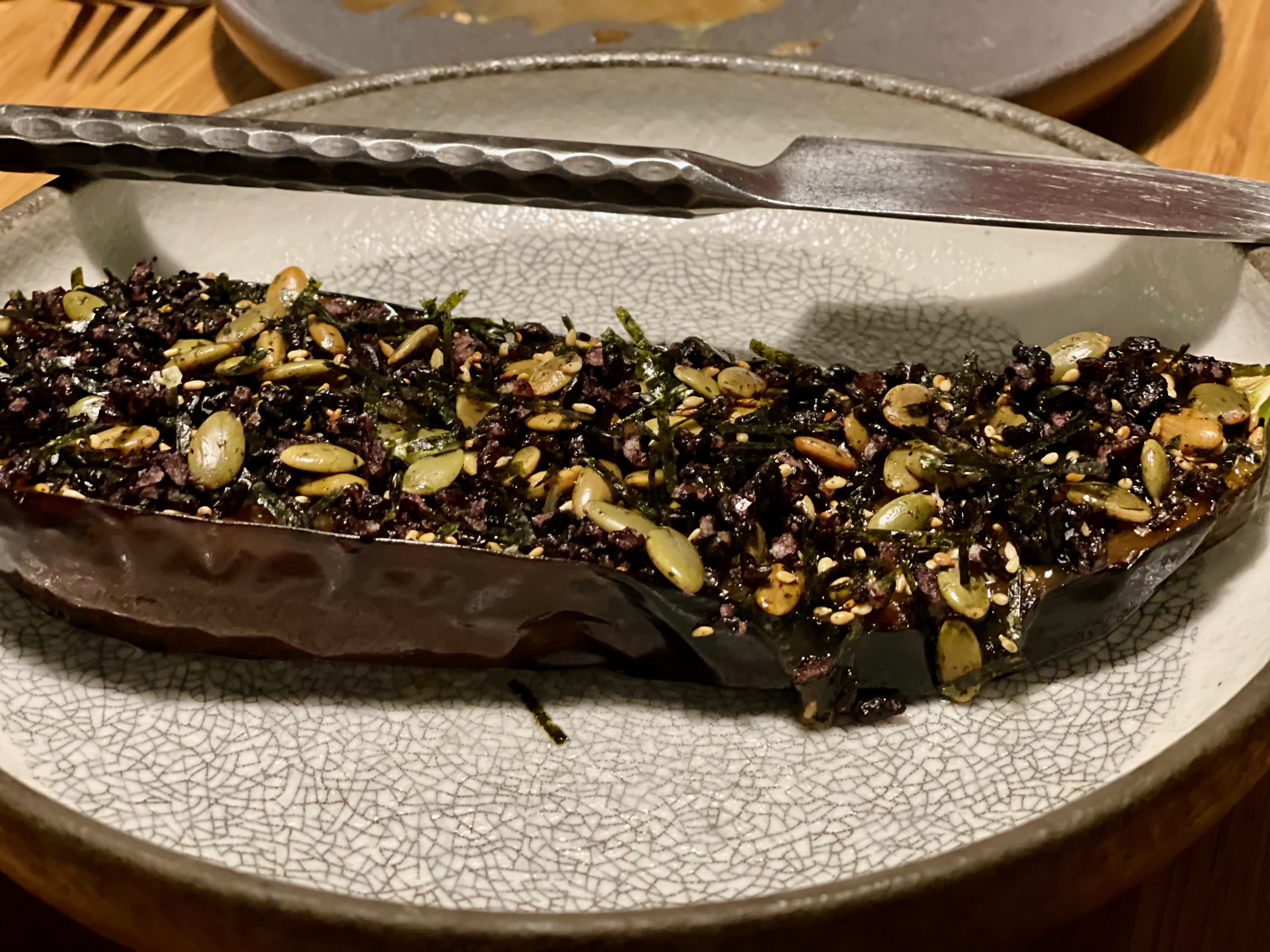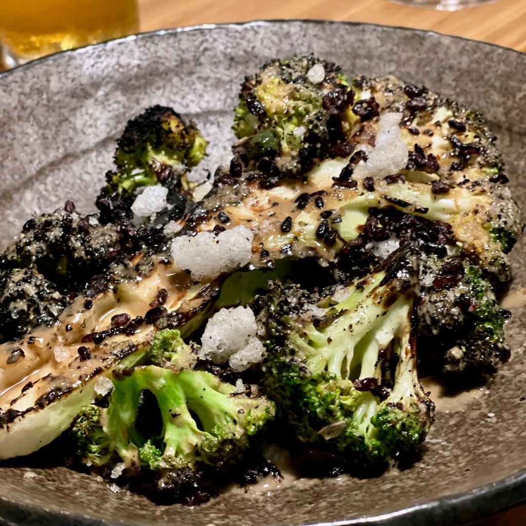 This was followed by 3 medium plates – chicken and prawn dumplings; charcoal-roasted broccoli with lemon anchovy soy (quite possibly the best broccoli dish I’ve EVER eaten and a contender for my dish of the night); and miso dengaku eggplant with pepita, puffed grains and nori (another favourite dish of the night).