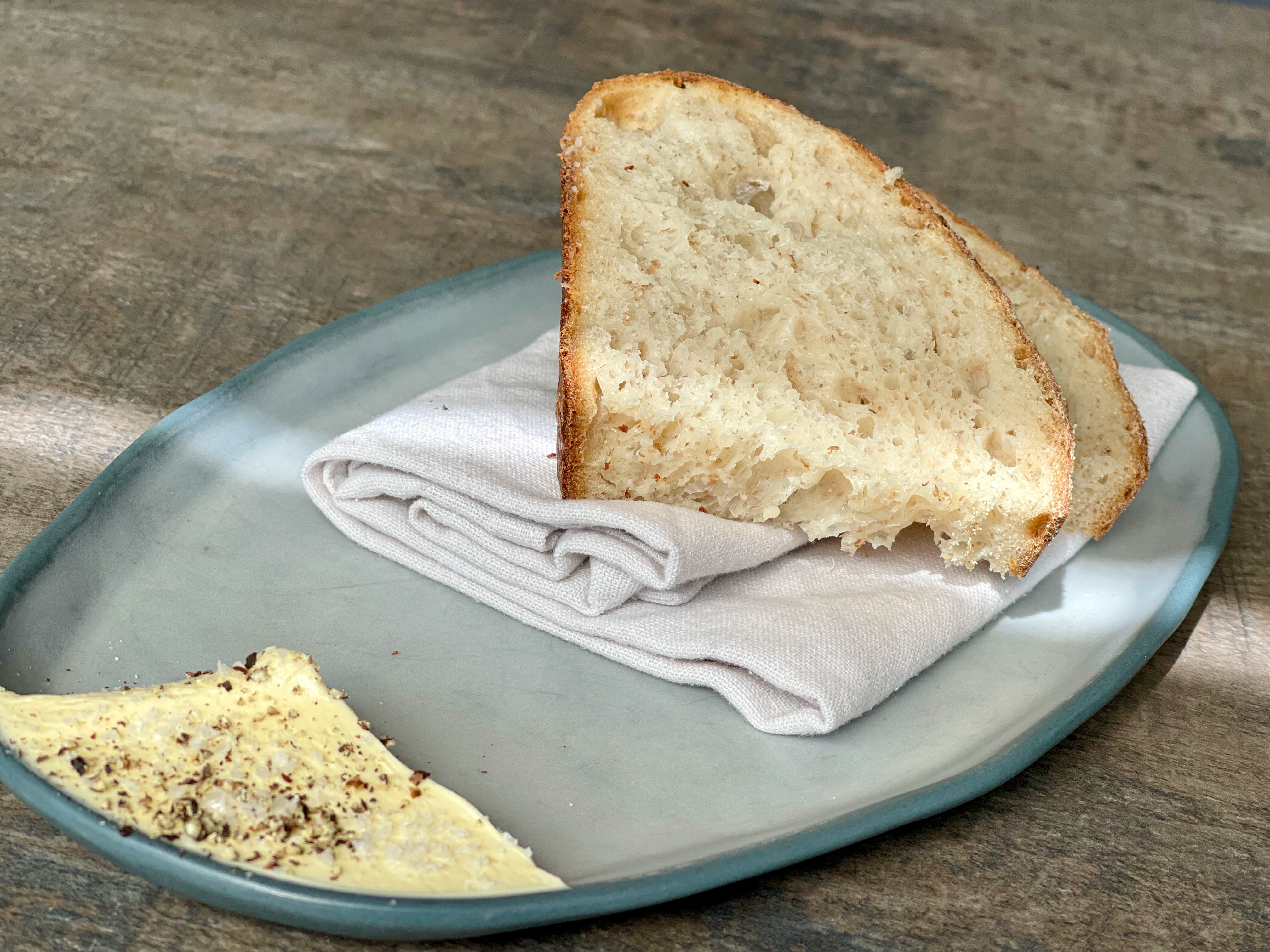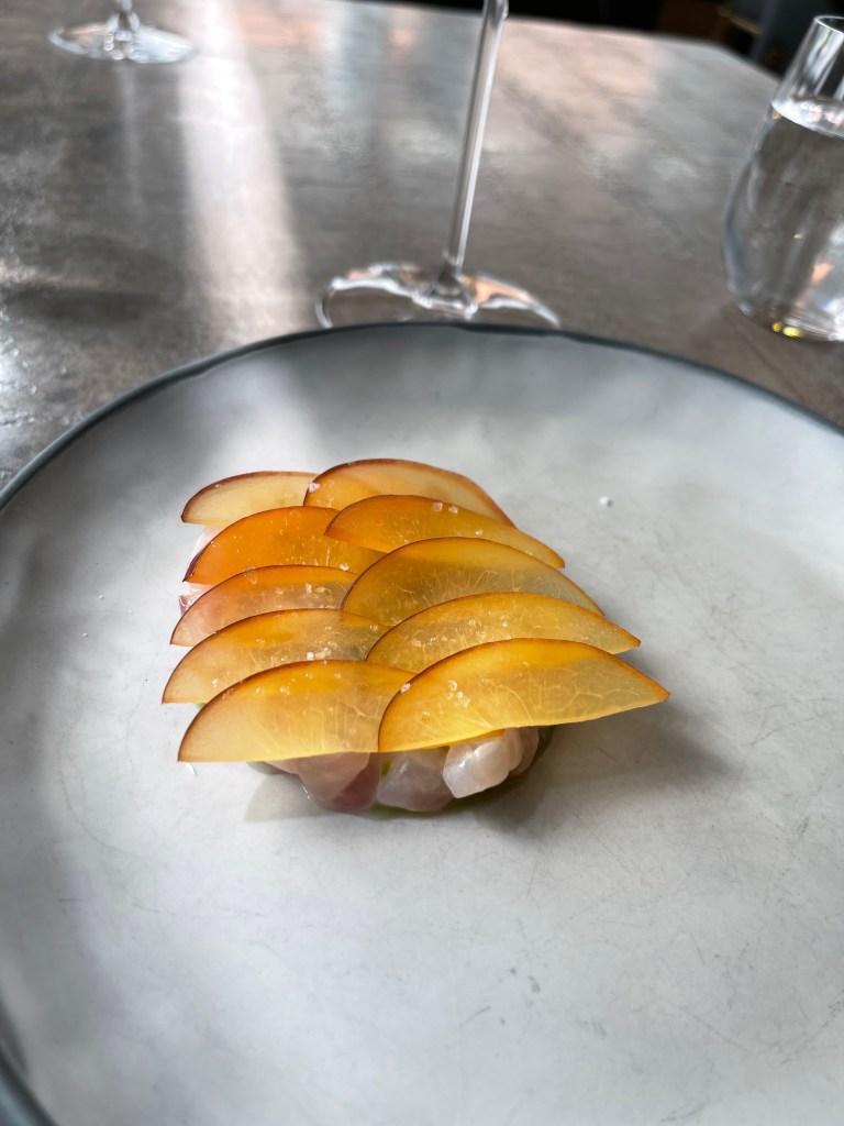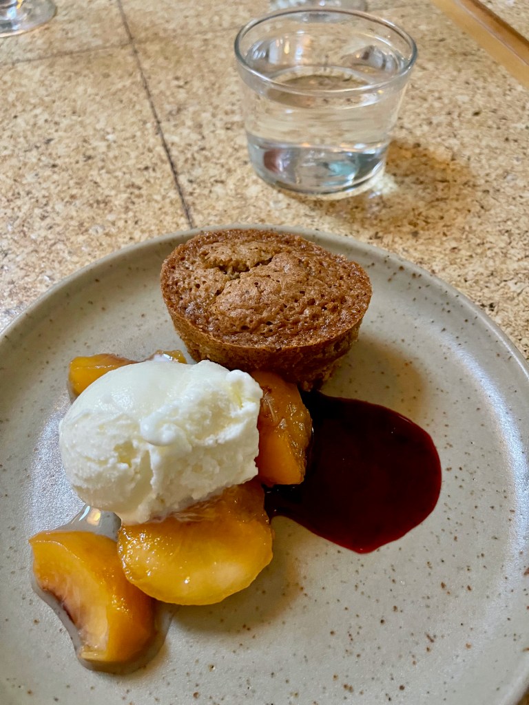 First up was an amuse-bouche of crispy cheesy puff pastry and extremely good butter. This was followed by smoked snapper with golden beets and a buttermilk dressing; and then sirloin with peppers, and tomato. Dessert was a burnt butter cake with yoghurt and lemon verbena ice cream, peaches and a raspberry coulis.