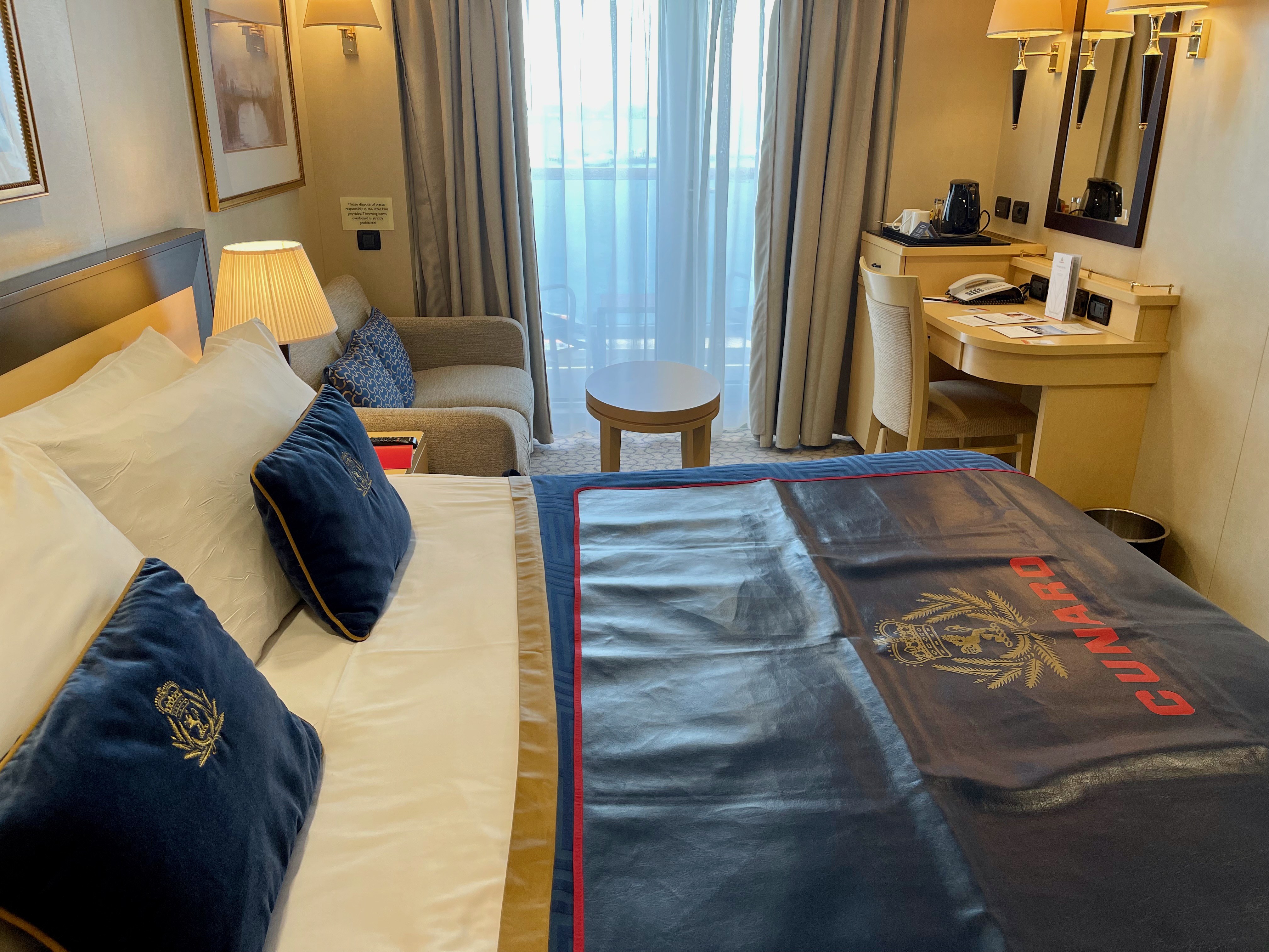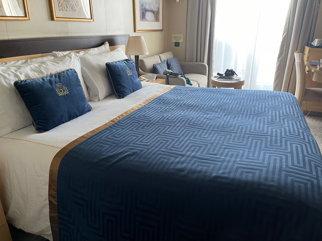 Upon arriving in our room we found the steward had prepared the bed with a protective cover to enable our suitcases to be placed on it without damaging the bedspread. Speaking of which, by the time we made it on board, our suitcases were waiting outside our room.