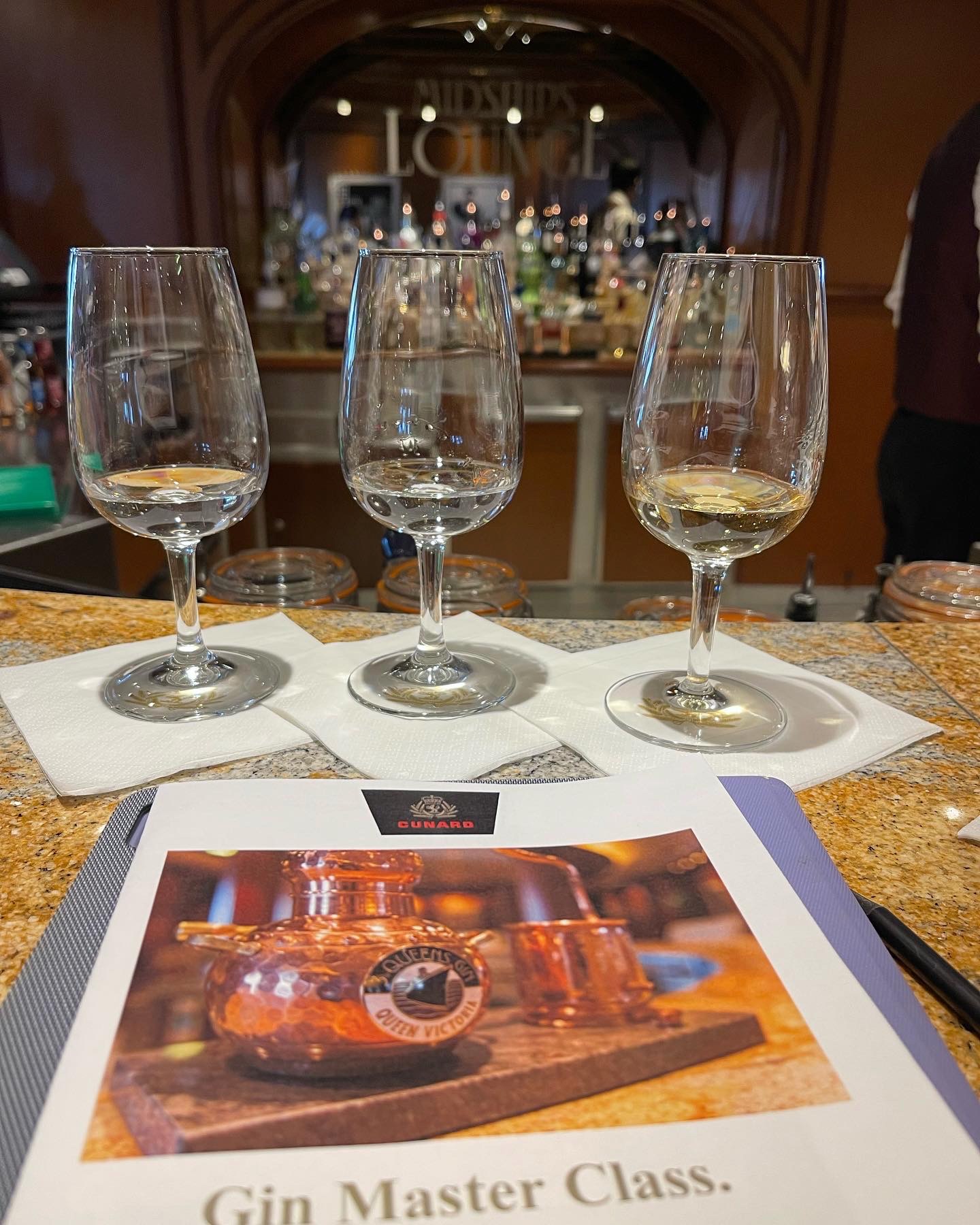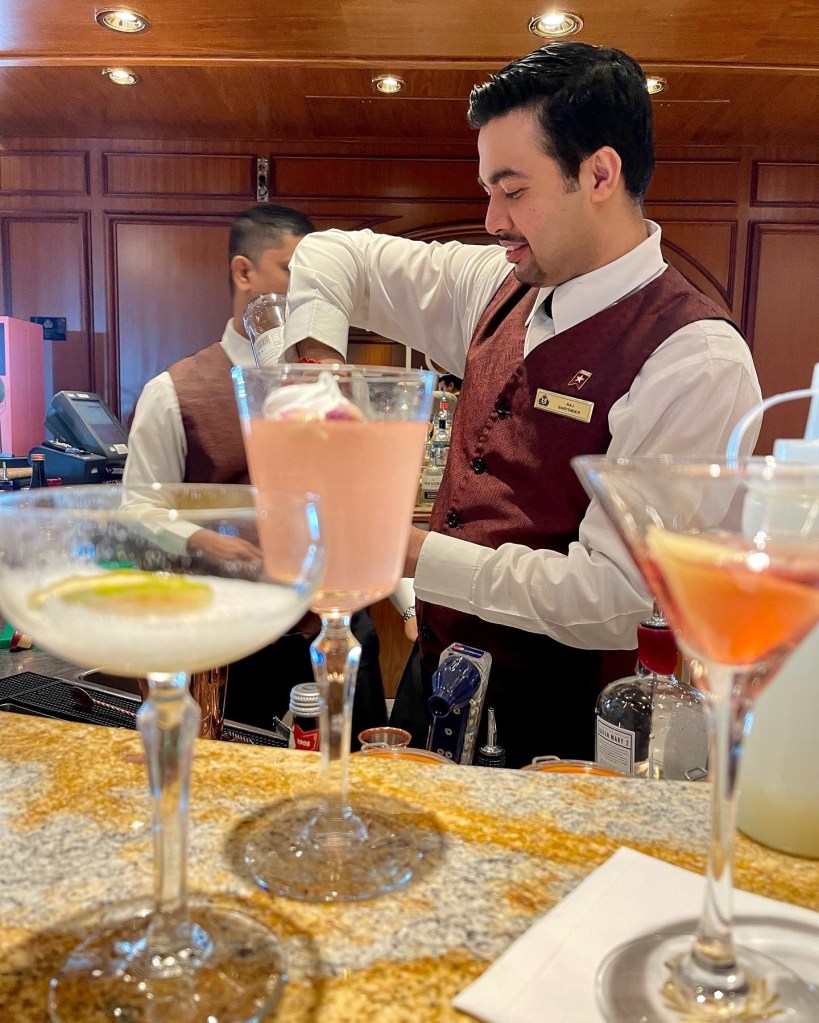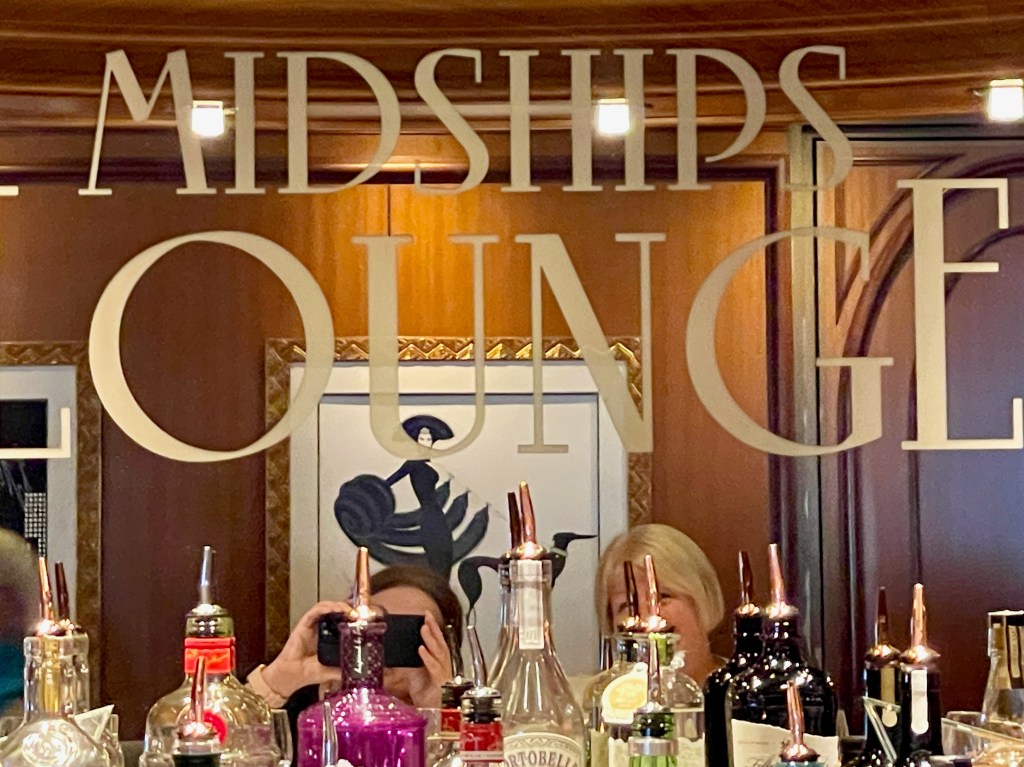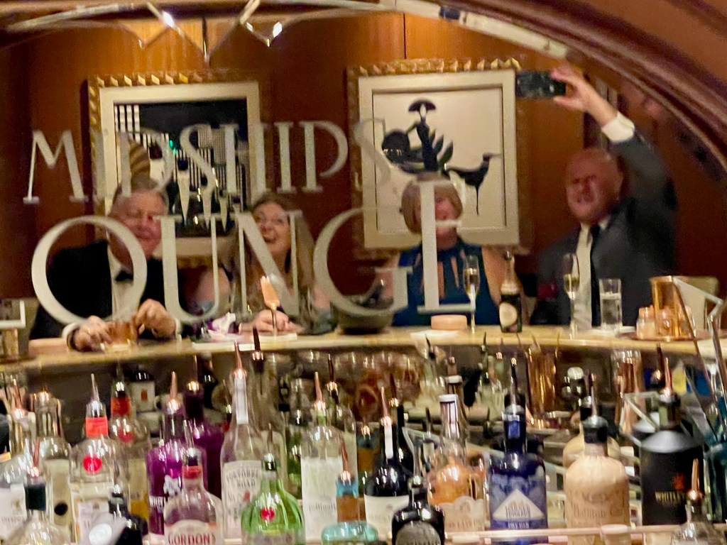 While Grant would have a beer while playing bingo, most days we tried not to drink alcohol until late in the afternoon. Then we’d have sundowners in The Chart Room or The Commodore Club (above) and finish up most nights at the gin bar (below).