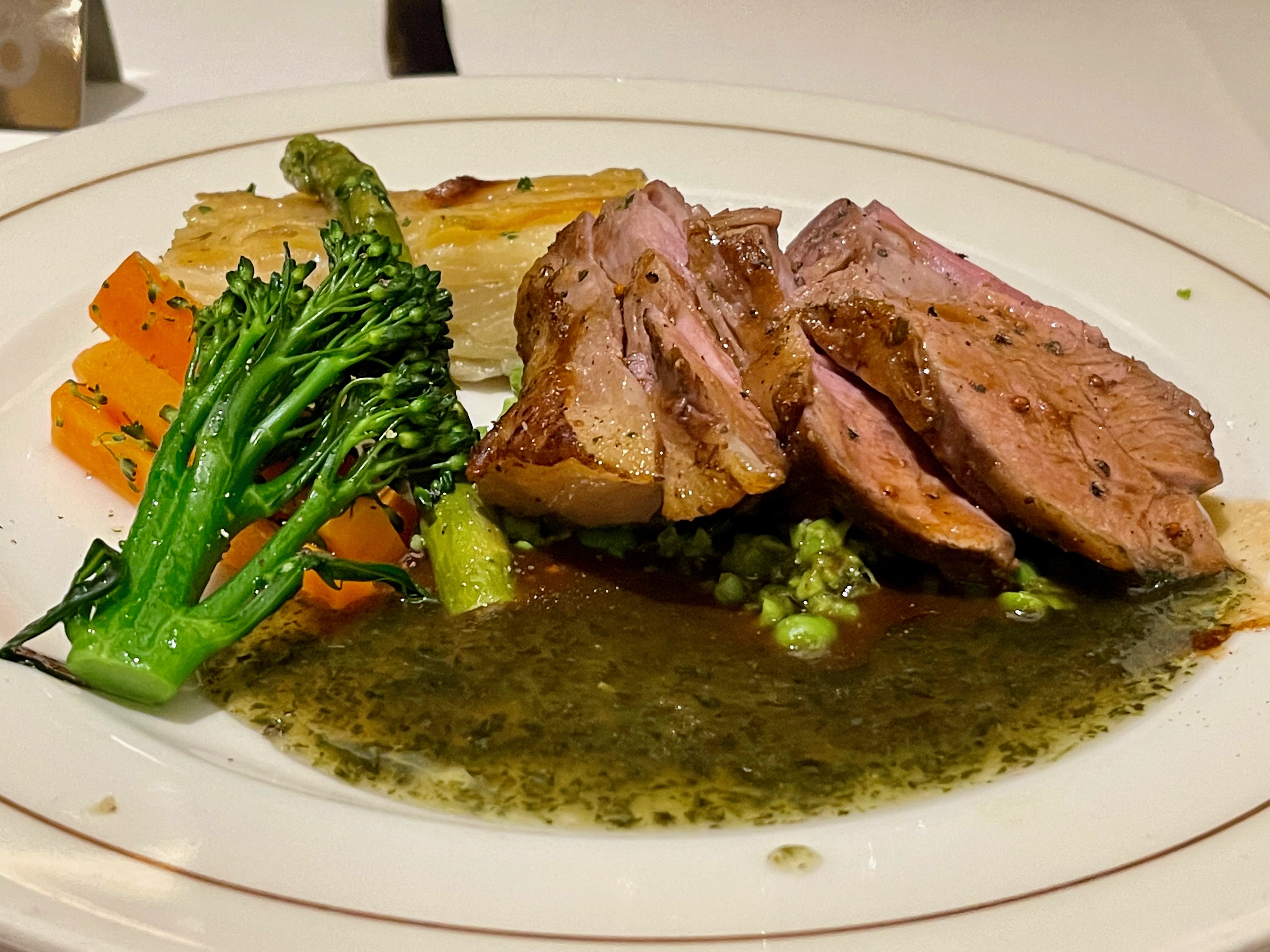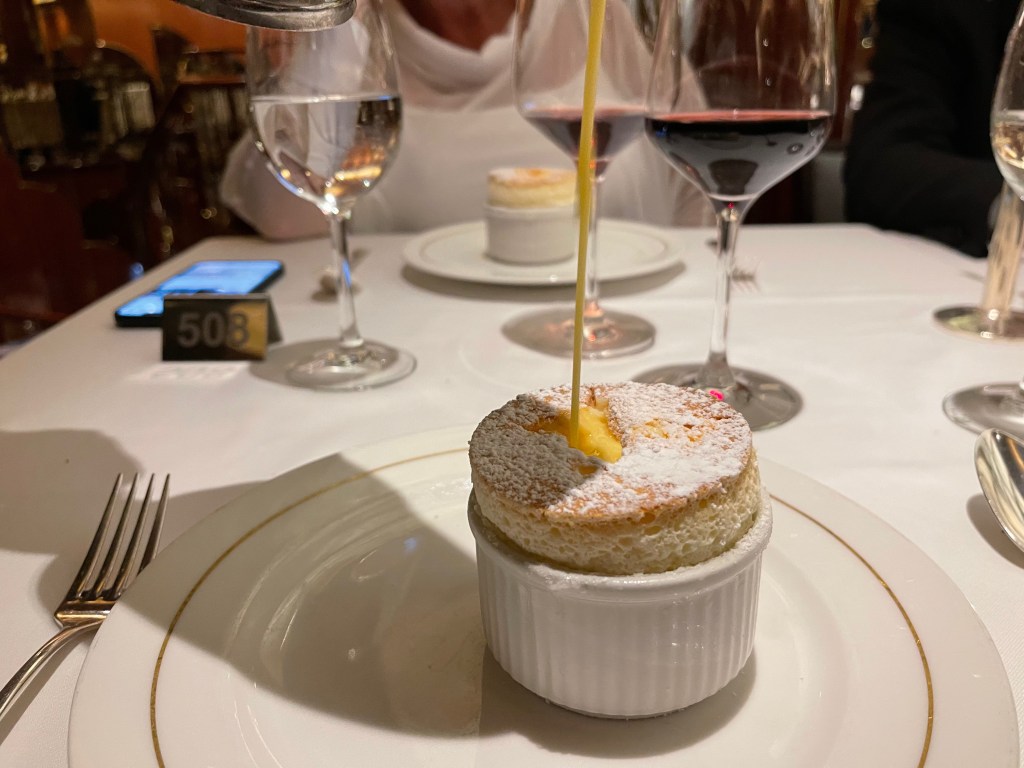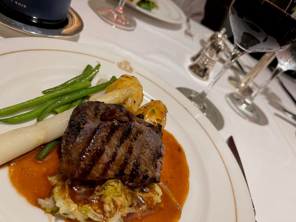 The main restaurant is open for breakfast, lunch, and dinner and while you don’t have set times or tables for breakfast and lunch, upon boarding you’re allocated a time and a table for your evening meal for the length of the cruise. We opted for the early seating (6.30pm) and for a table for the four of us. We had the same servers and sommelier each night and got to know them well.