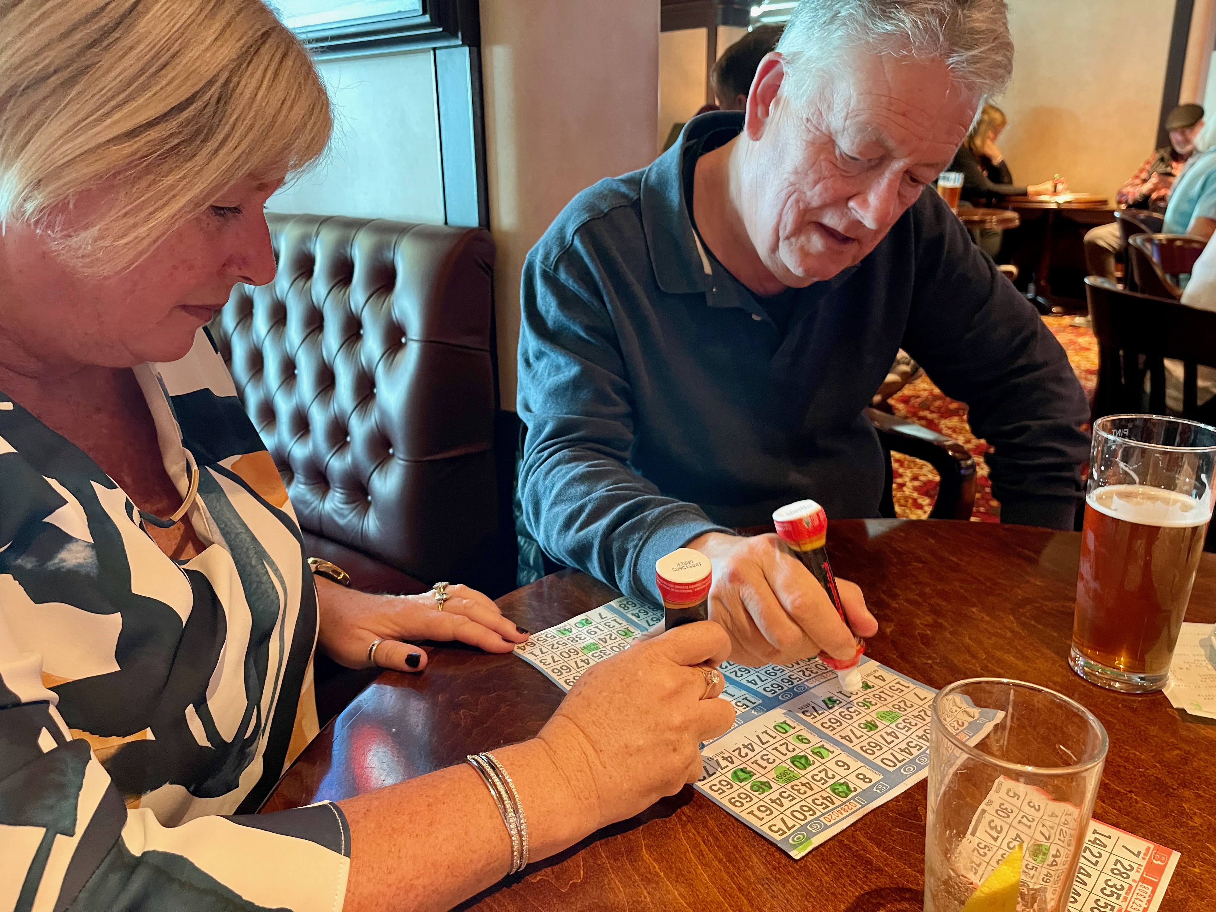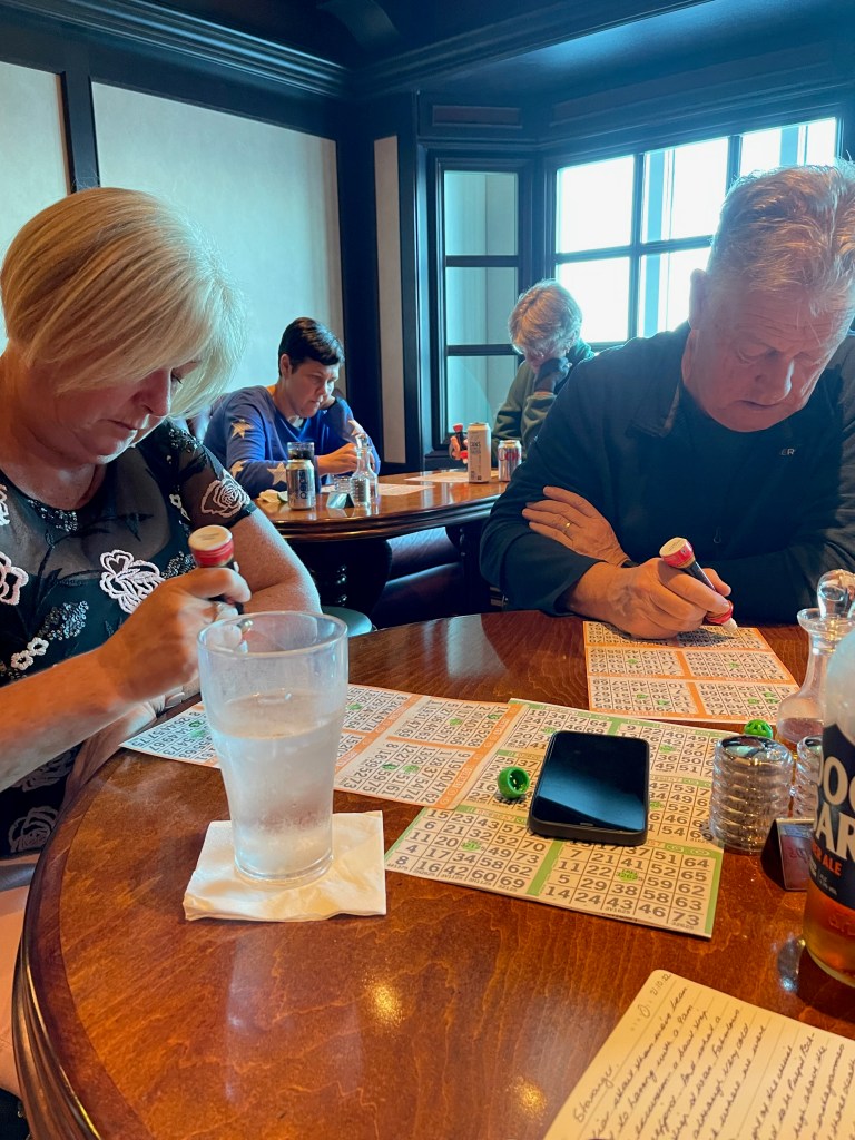 While we were finishing line dancing Grant would save a seat in the pub for 11am bingo. He and Heather would play (I don’t have the focus) while I updated my journal. They began by sharing a card but by the end of the cruise were multitasking with multiple cards and arguing about who their favourite caller was.