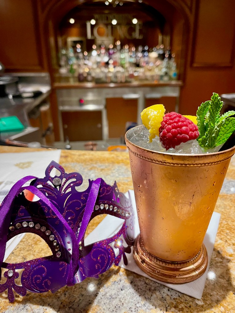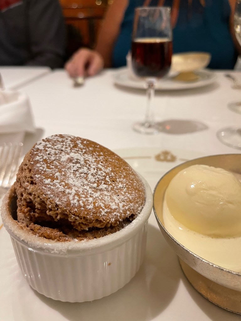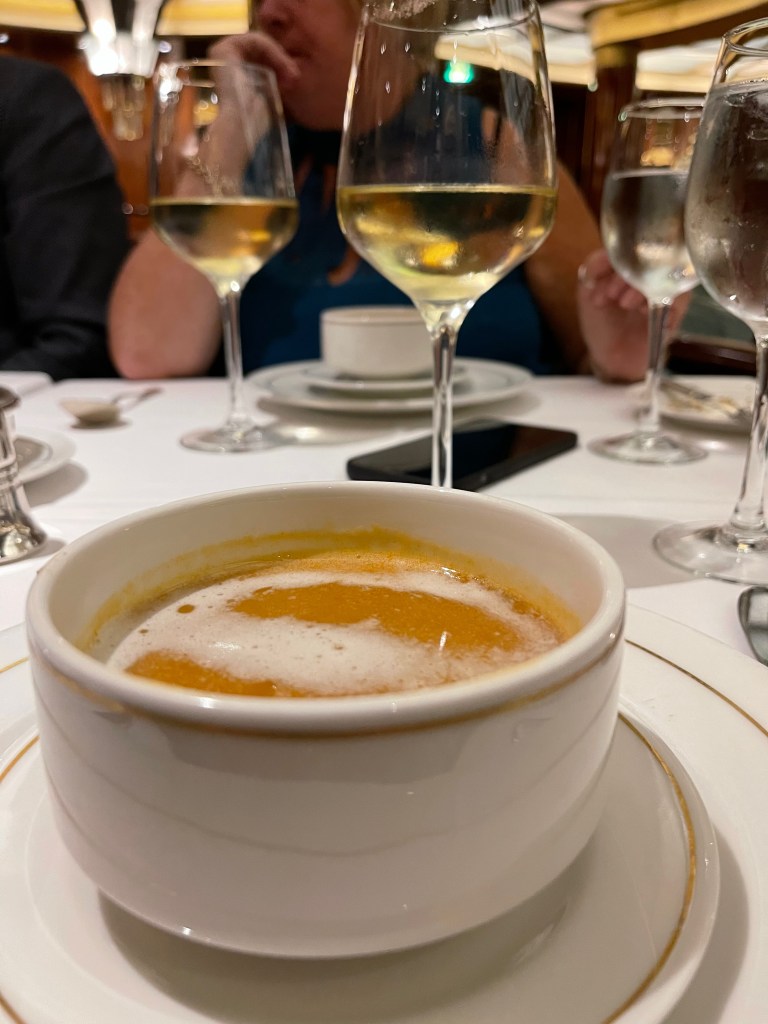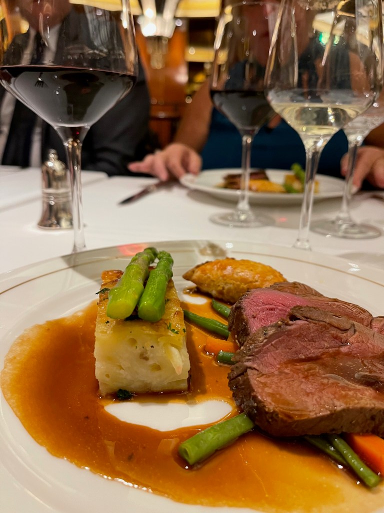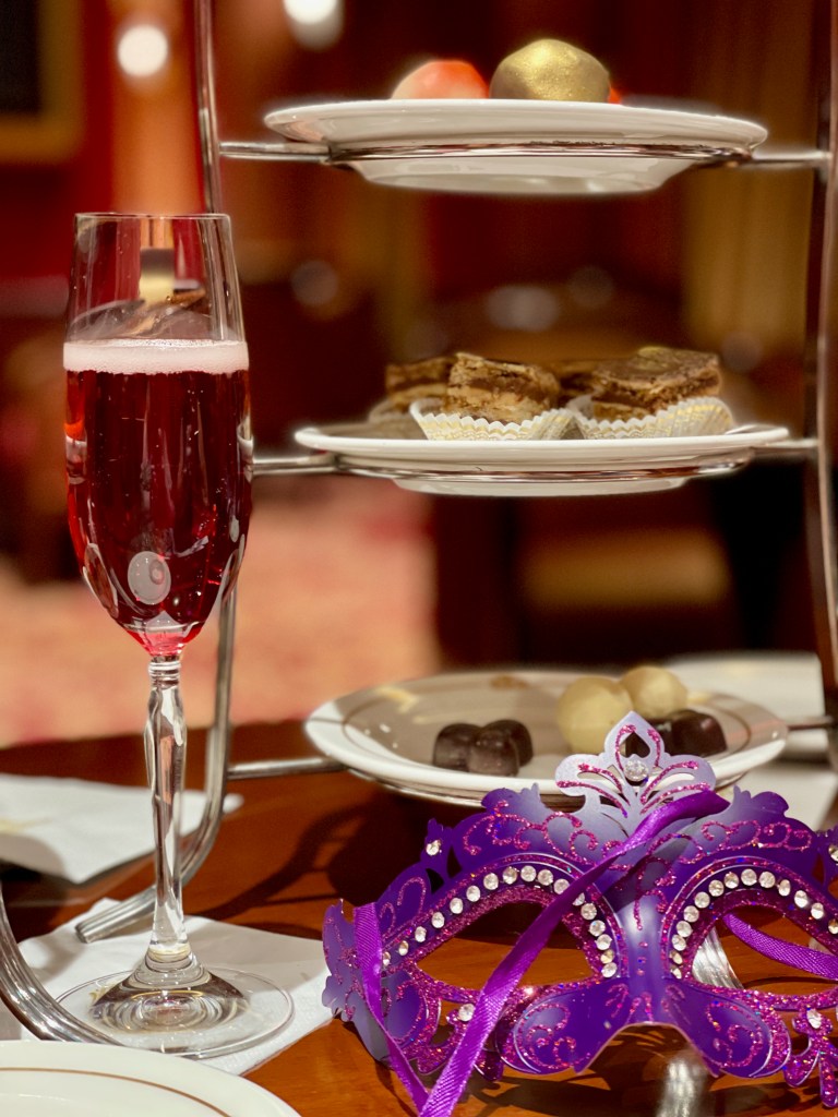 It was a big night last night. Masquerade night on board, it was the best menu so far – lobster bisque, Chateaubriand, chocolate souffle – and we followed that up with more champagne and more chocolate in the private box at the theatre. After all of that we finished the evening at the gin bar and drank way too much.