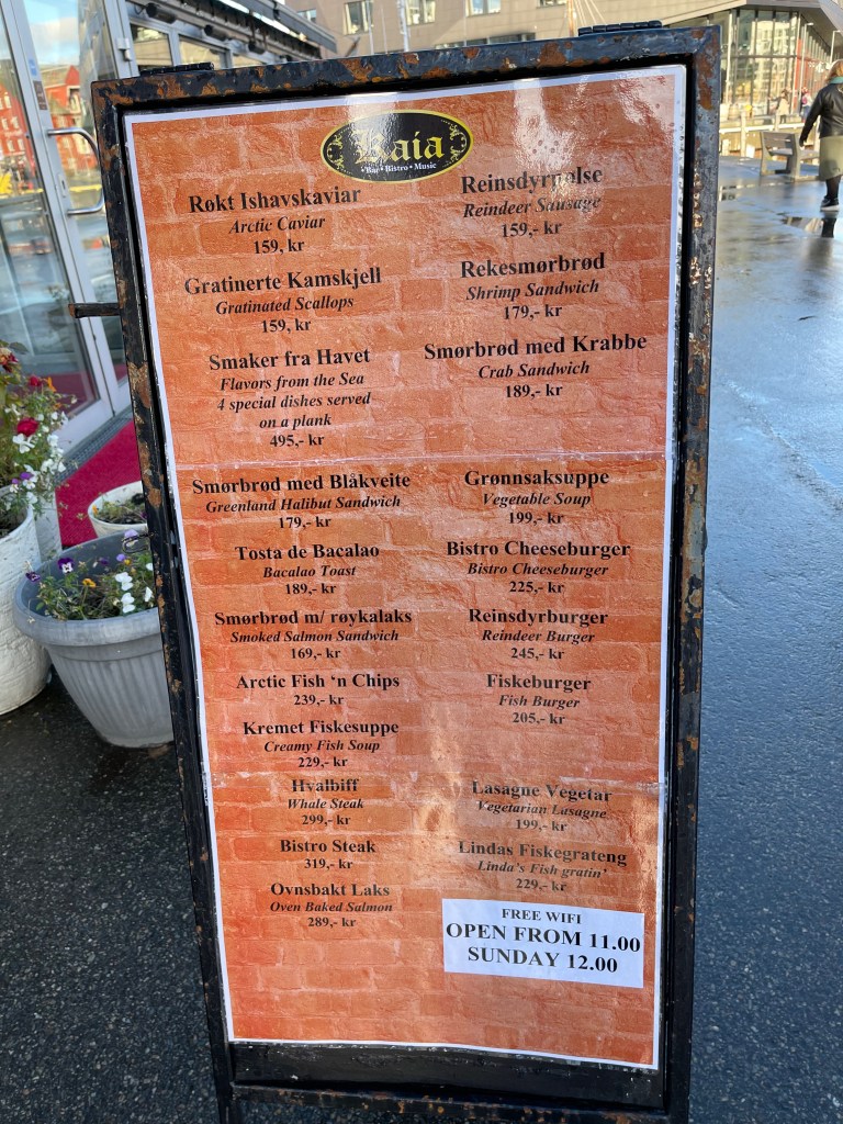 Being Sunday other than tourist shops there wasn’t a lot open in town so we just wandered. I was surprised to see whale salami on sale in the tourist shops – and available for tasting. Norway is one of the few countries that didn’t sign up to the international bans on whale hunting so it’s legal here. I understand that this is a cultural thing, but… no…just no. Upon googling I read that the vast majority of the population (up to 98%) is against it too. I wondered then whether this is for the tourists, but saw it on a couple of menus around town. Again no…just no.
