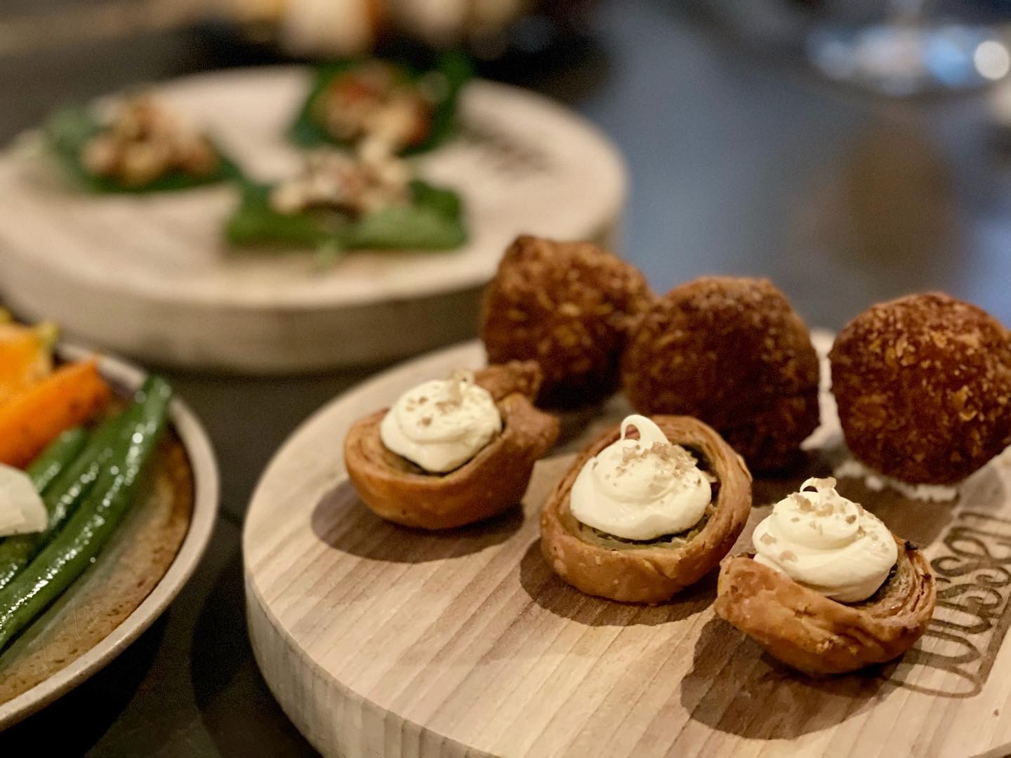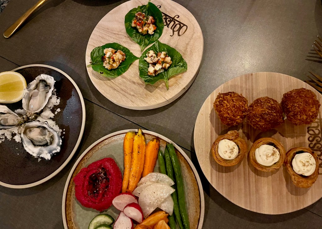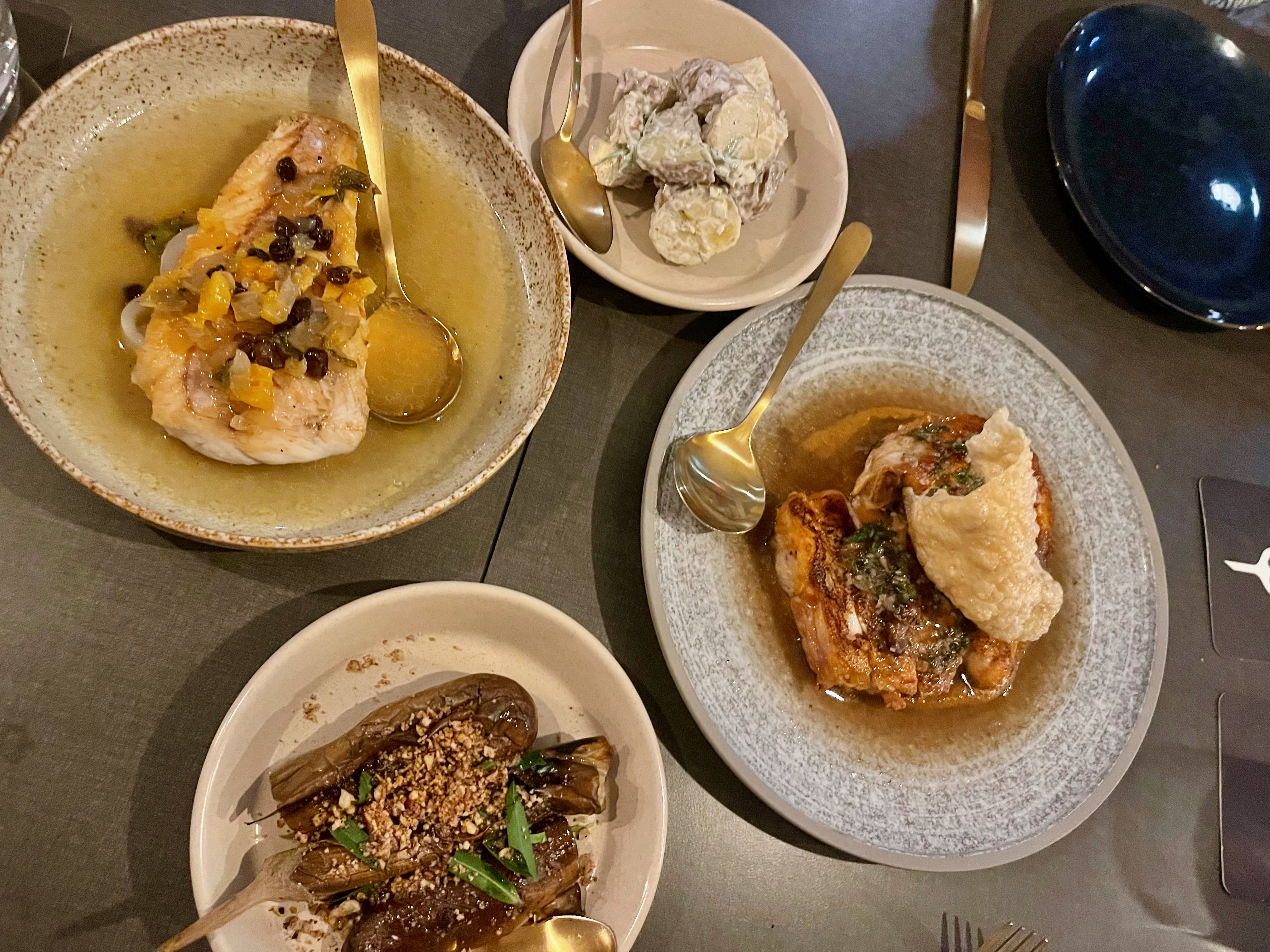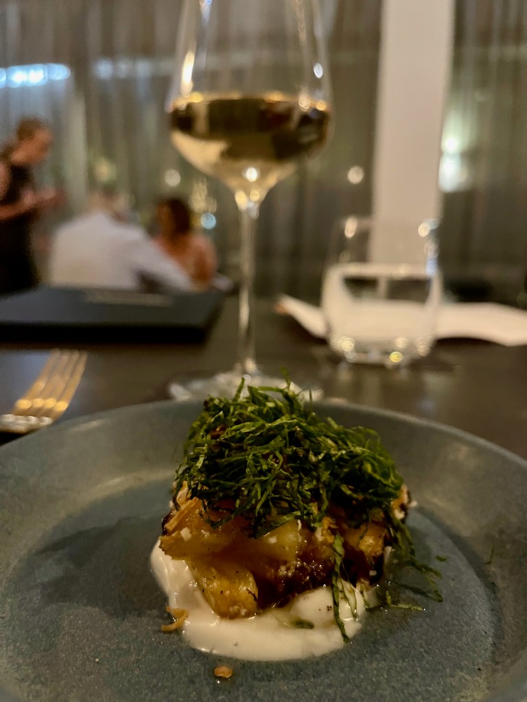 We began with a few oysters and a plate of veg and beetroot hommus which was served with amazing bread and (wait for it) chicken fat butter (oh my giddy aunt). The sharing starters were also brought out – a Thai-style octopus on betel leaves, mini spanakopita with sheep’s milk cheese on top, and little lamb meatballs with goat’s cheese and a green olive in the centre.
