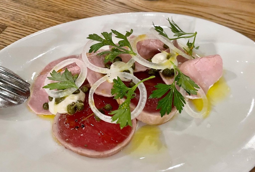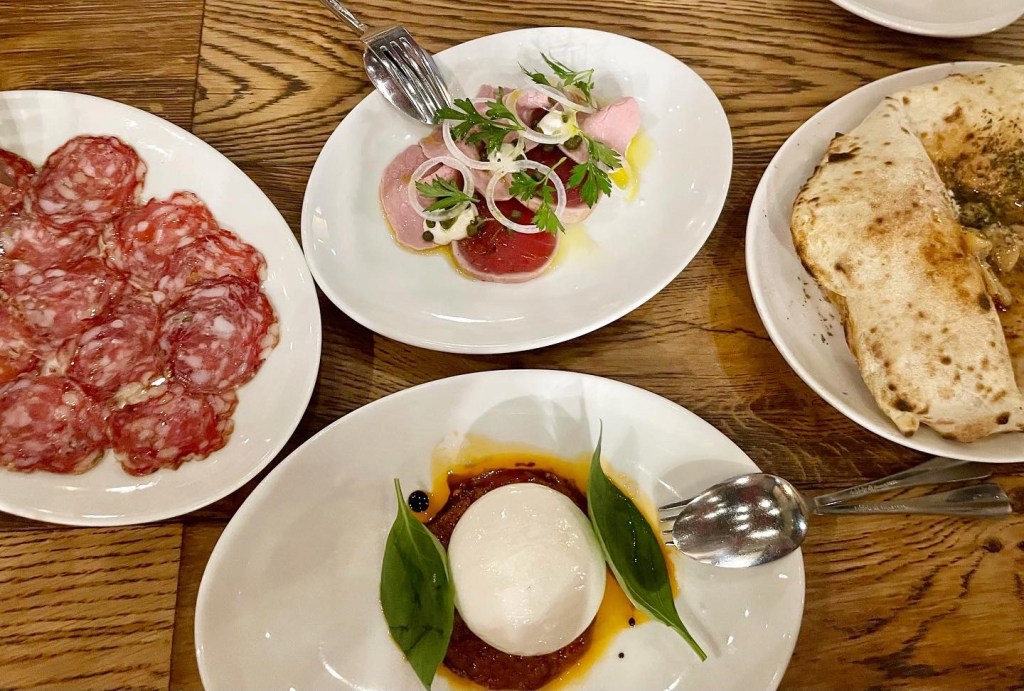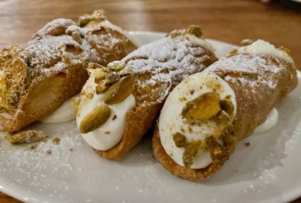 First up we shared burrata, salami and vitello tonnato. To follow Sarah had seafood pasta, Grant a pizza and I had a carbonara the way it should be – pancetta, egg yolk, parmesan, no cream. Afterwards we shared a plate of cannoli.