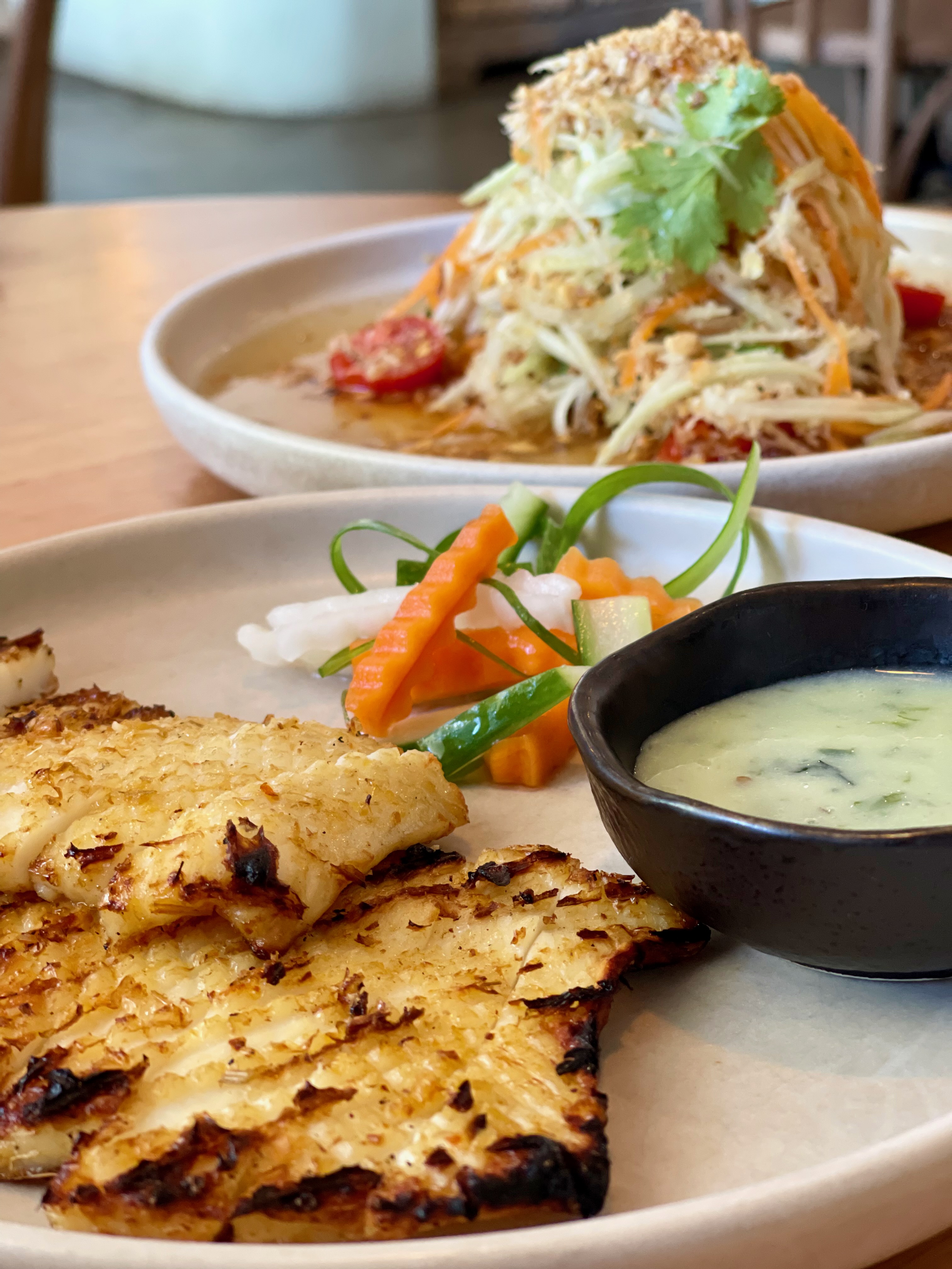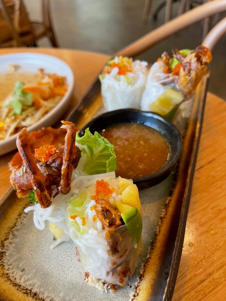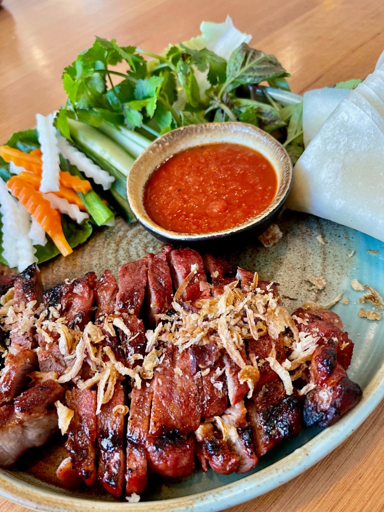 We shared some small plates – grilled sate calamari, and soft-shell crab rice paper rolls – a green papaya salad, and ‘Xá Xíu’ Char Siu Pork Neck DIY Wraps.