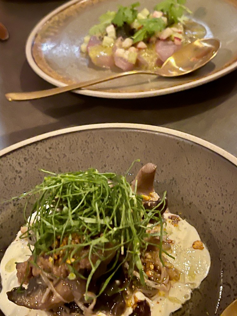 Next out was an amuse bouche of char-grilled pineapple, coconut, chilli and mint. Next were the share entrees – a confit mushroom dish with XO sauce (my dish of the night), and rockfish crudo (Grant and Sarah’s dish of the night). The pics don’t do these justice.