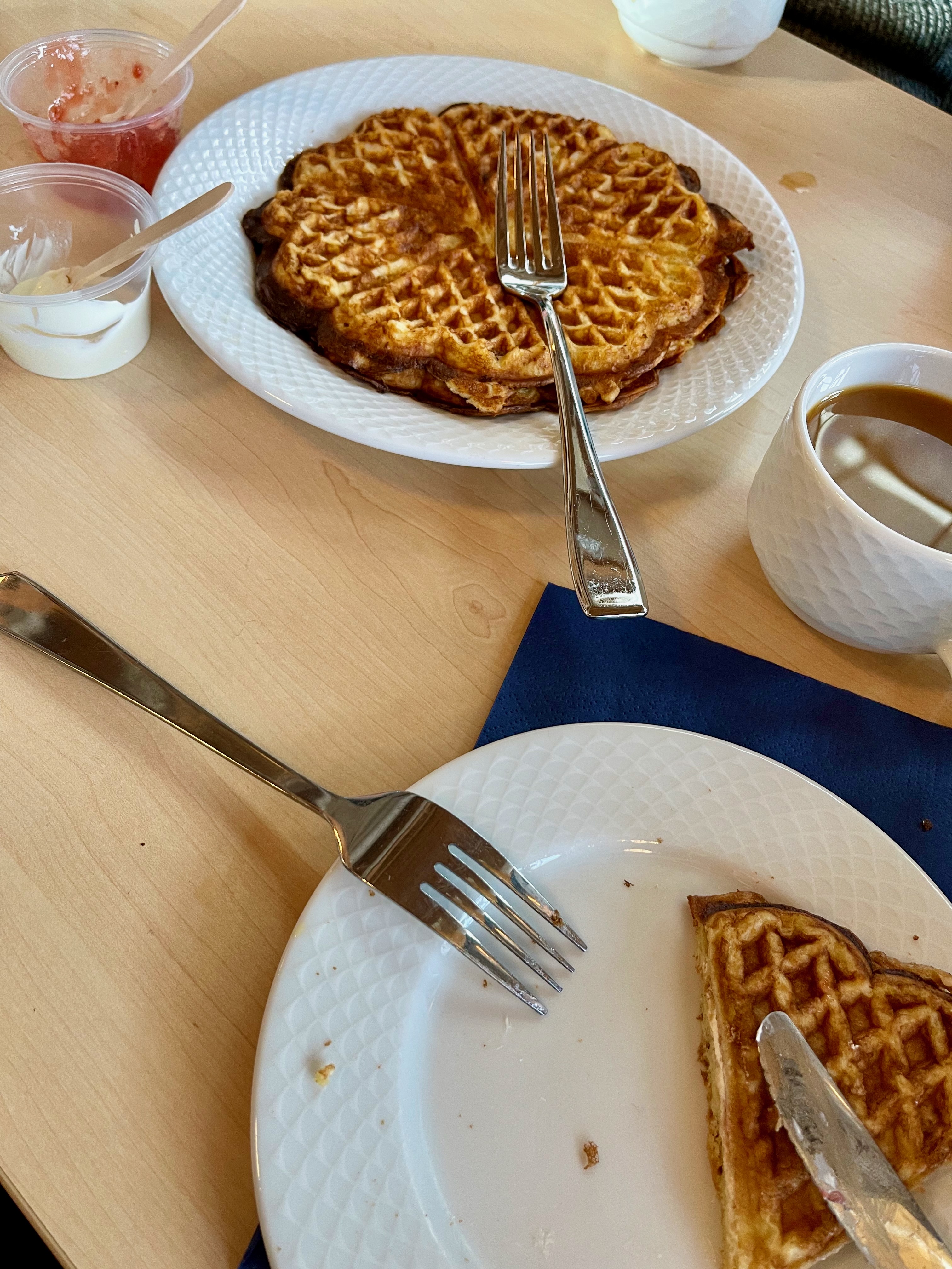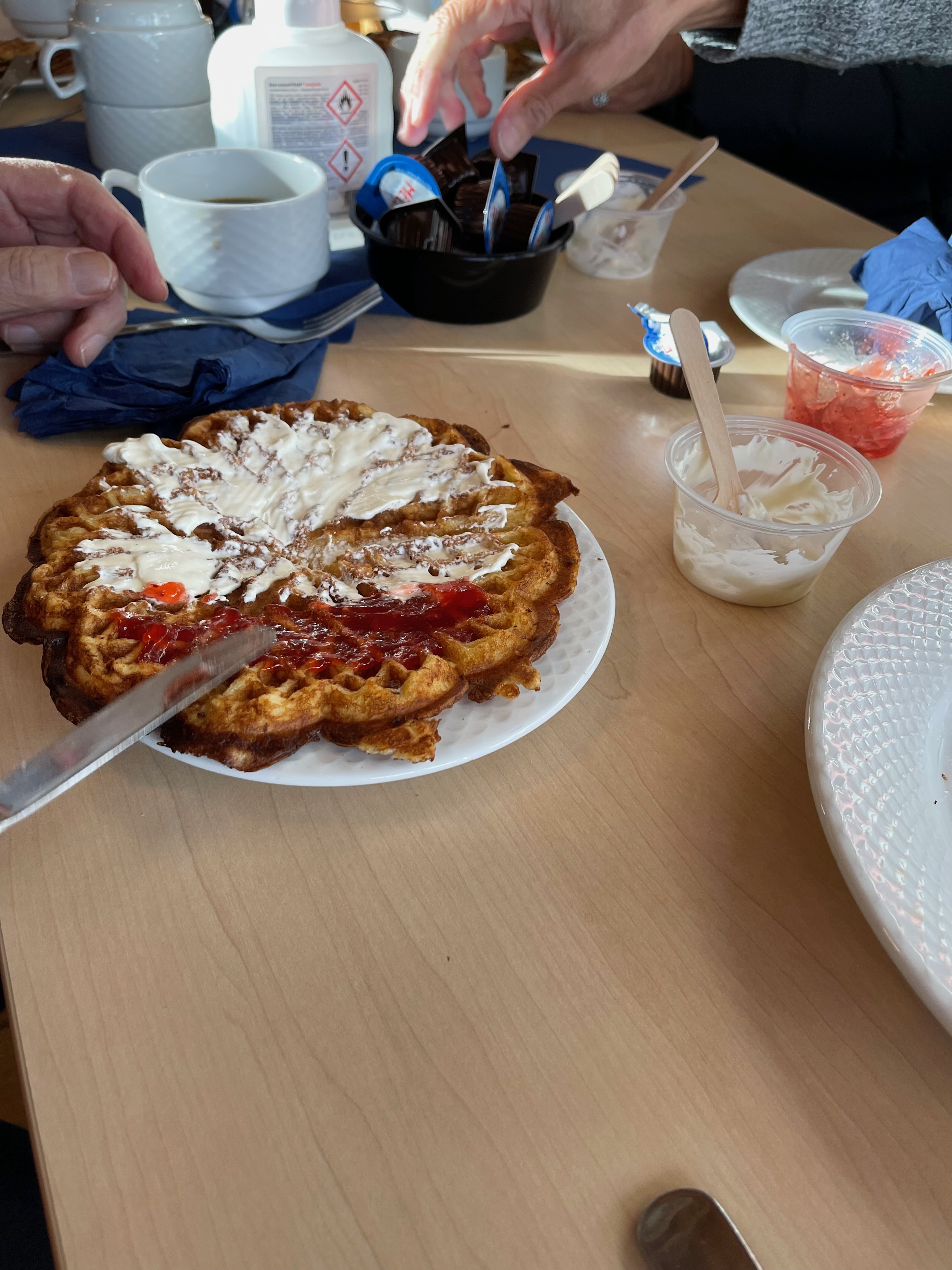 On the way back we stopped at a cafe (I suppose it must have been in Forsand) where we had Norwegian waffles with jam and cream. They’re very different from the American ones we’re all used to – sort of thin and floppy but a tad crunchy on the edge. I’m not a waffle fan so didn’t expect to like these, but did.