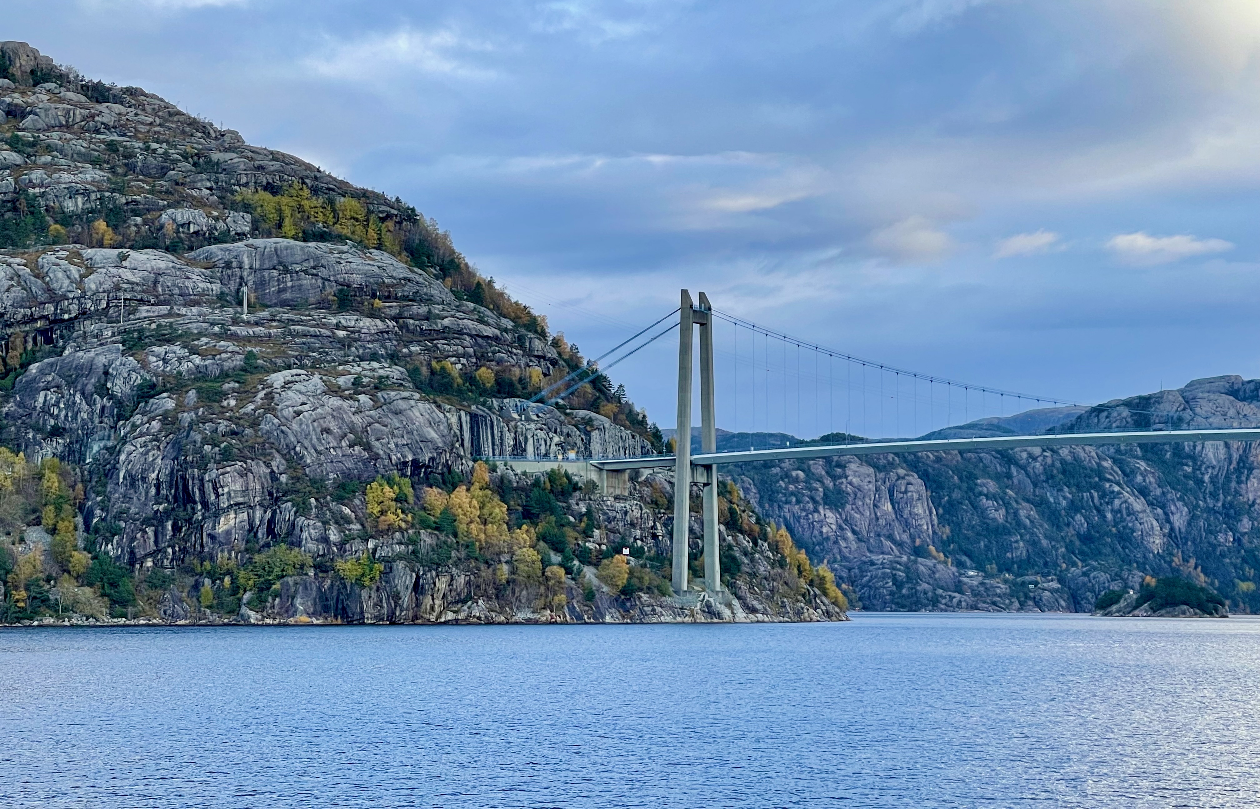 There’s just one crossing across the fjord (see the bridge below) and because it’s so mountainous there’s no road beside the fjord so the road goes through the mountain to the bridge.