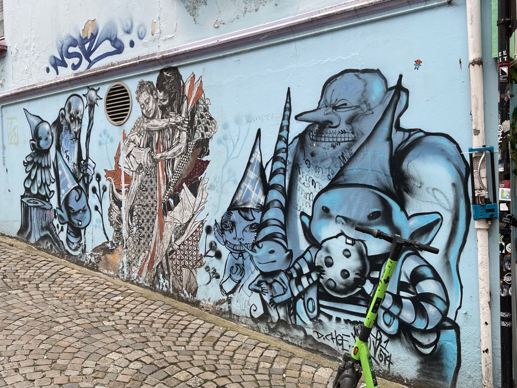 What an amazing place! So rugged where the land meets the sea, including a moody sky. And the bright buildings and murals are so inviting.