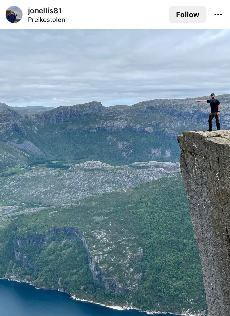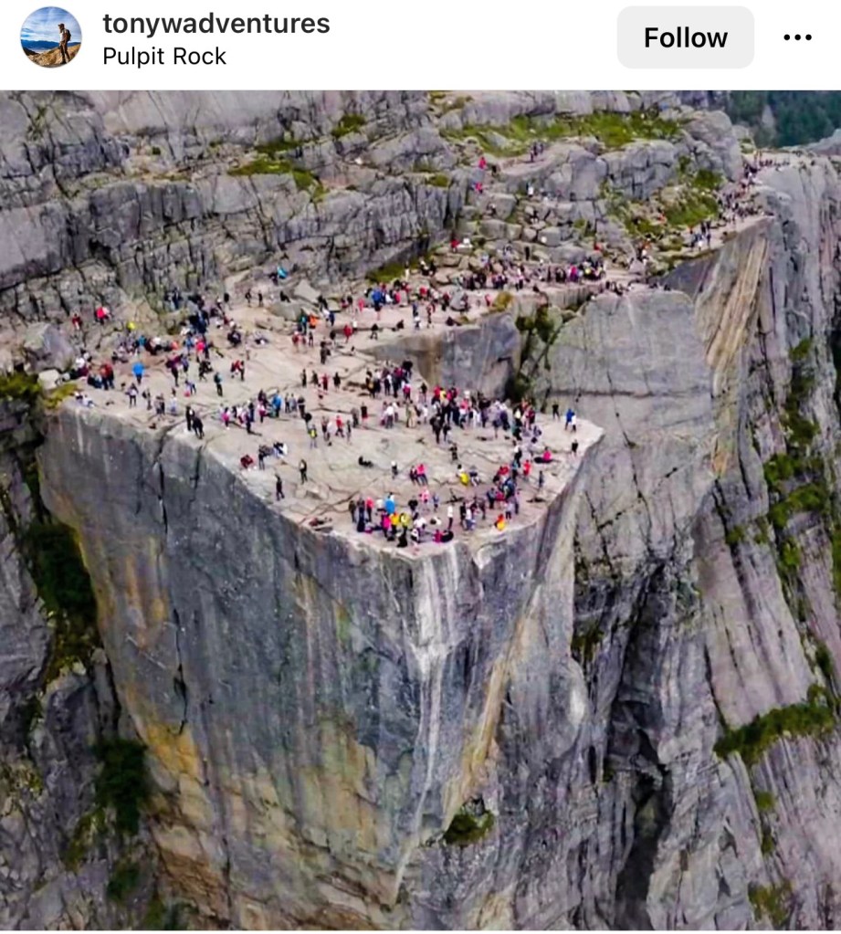 Preikestolen, or Pulpit Rock, is a dramatic mountain plateau 604 meters above the Lysefjord. Billed as the highlight of this trip, I’d never heard of it before now. Apparently Tom Cruise made it famous in one of the Mission Impossible movies but these days it’s Instafamous as well (see below).