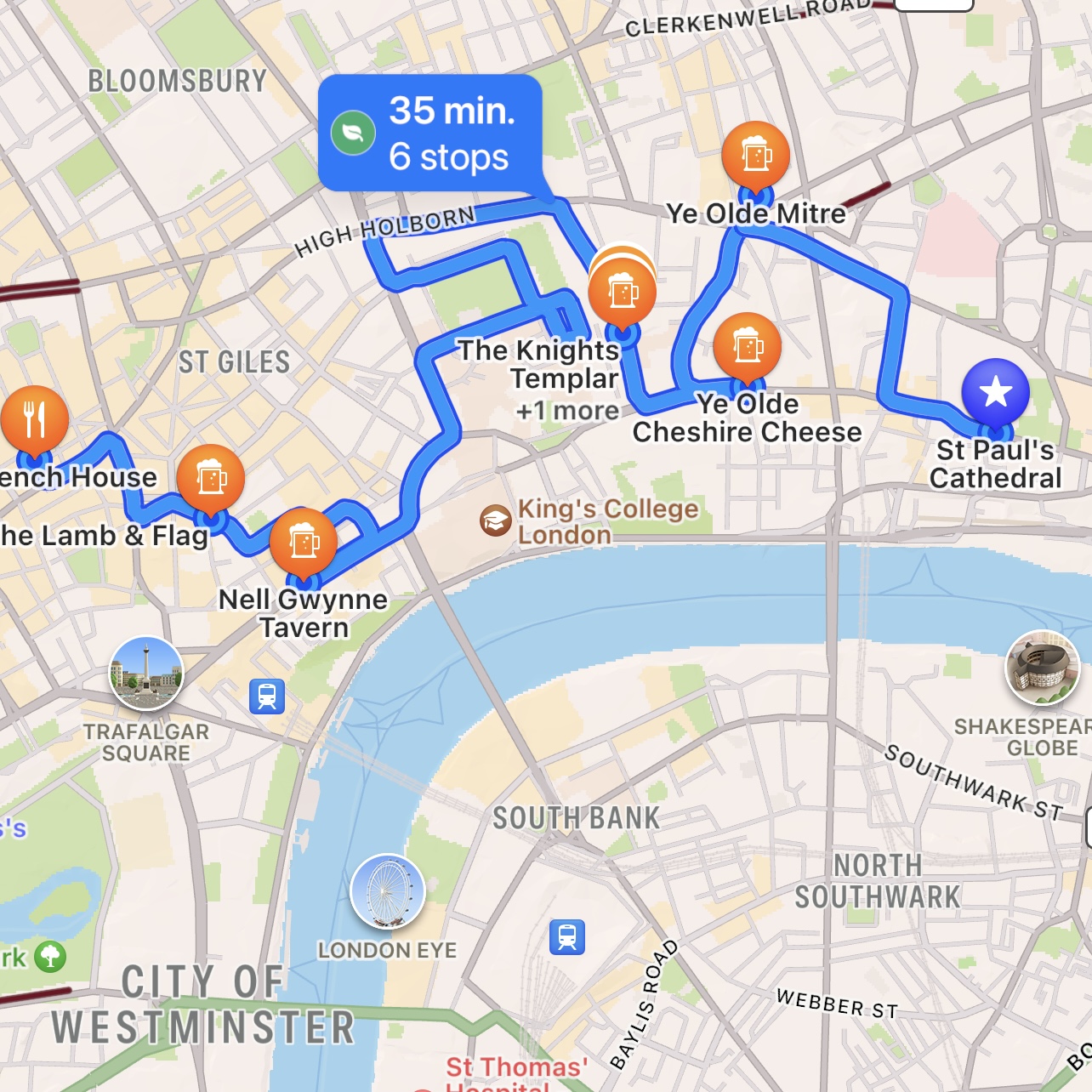 The map below gives you an idea of the locations of the pubs we visited… although we walked the routes so tended to deviate a tad…and our detours are not listed.
