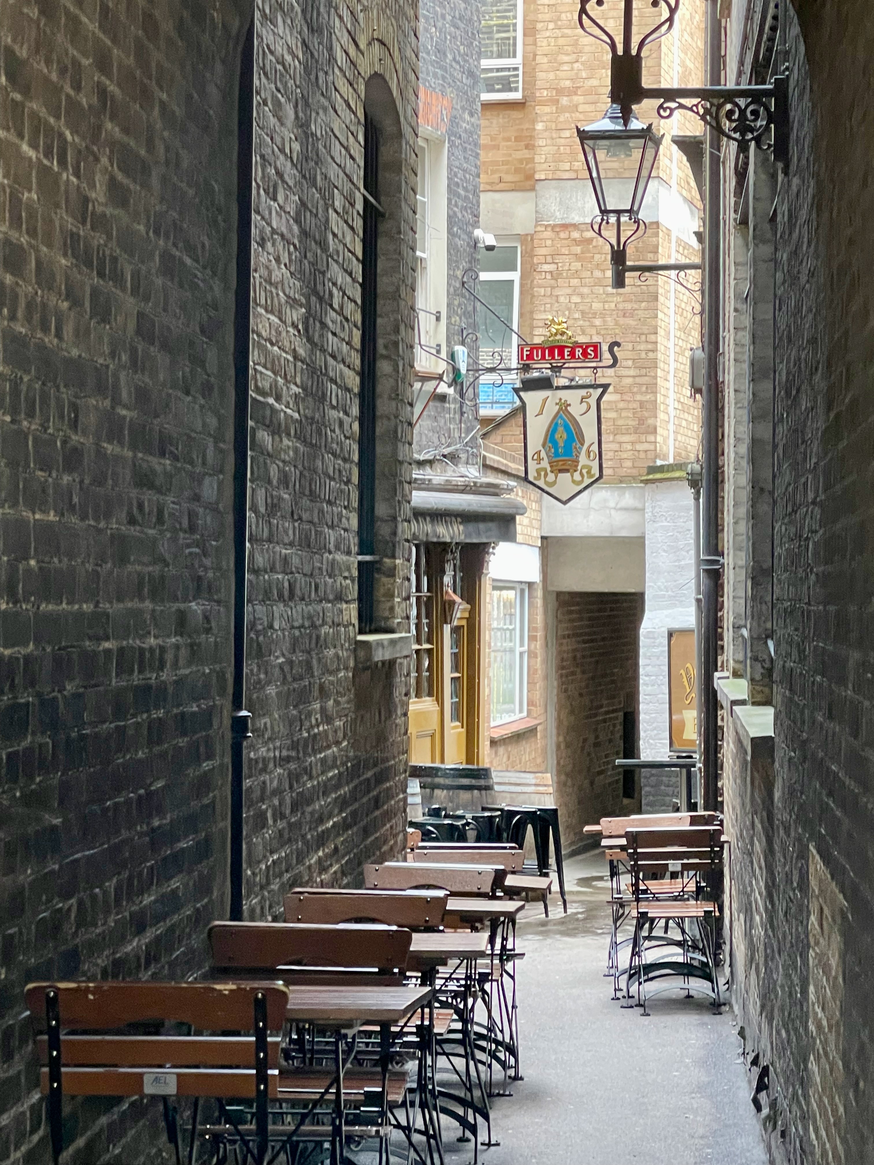 When we’re talking Dickensian pubs, this would have to be the first that comes to mind. Not only does it look Dickensian, but it’s located (not quite hidden on account of the sign on Fleet Street) up an alley that looks Dickensian, and, not only did Dickens regularly drink (and eat) here, but he was also (for want of a better term) writer-in-residence here.