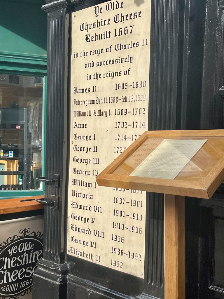 That pub, The Horn, was destroyed in 1666 during The Great Fire, this one taking its place just a year later…and it’s been here ever since. (As an aside, the board showing the monarchs has since been updated with Charles III.)