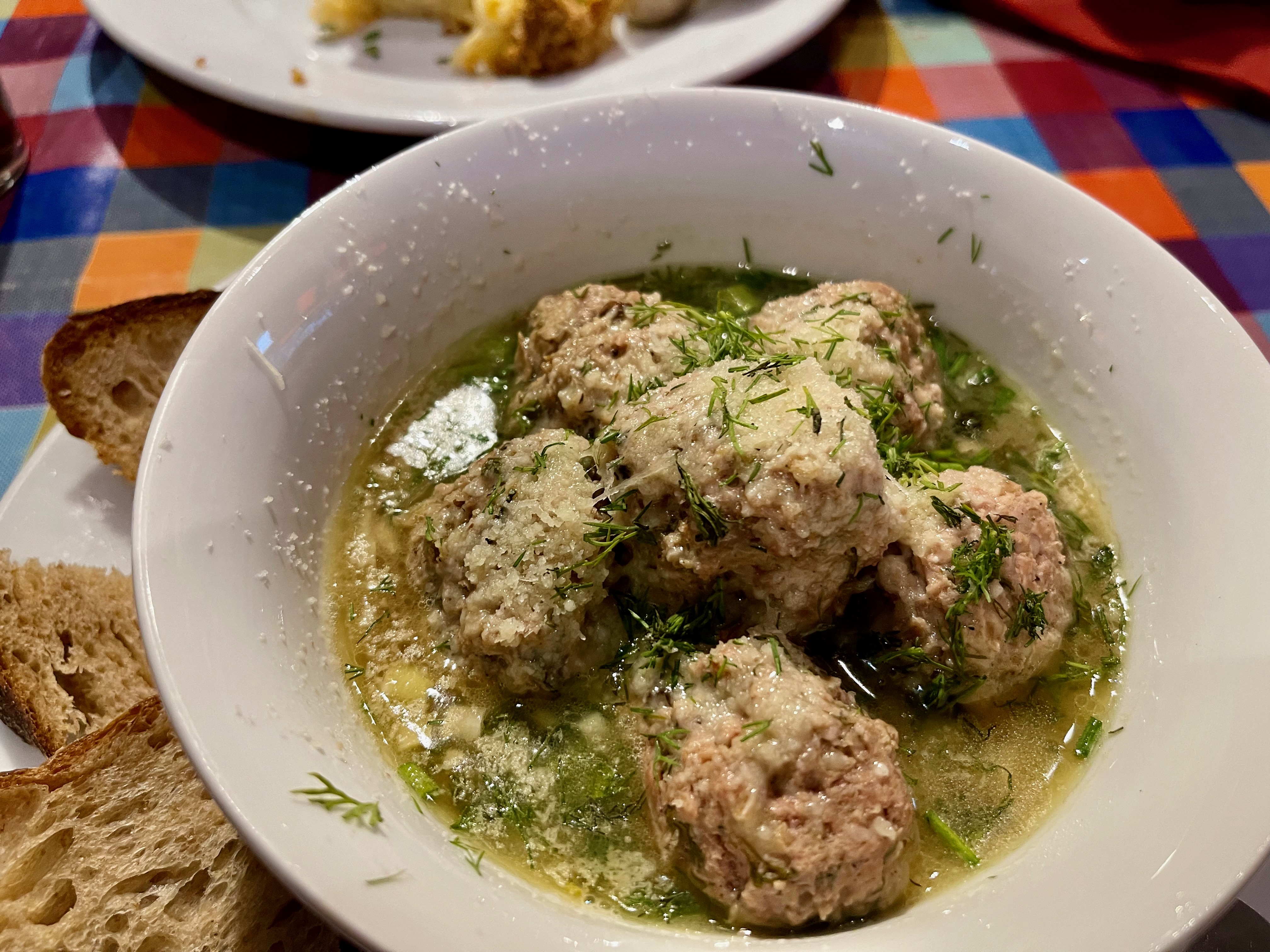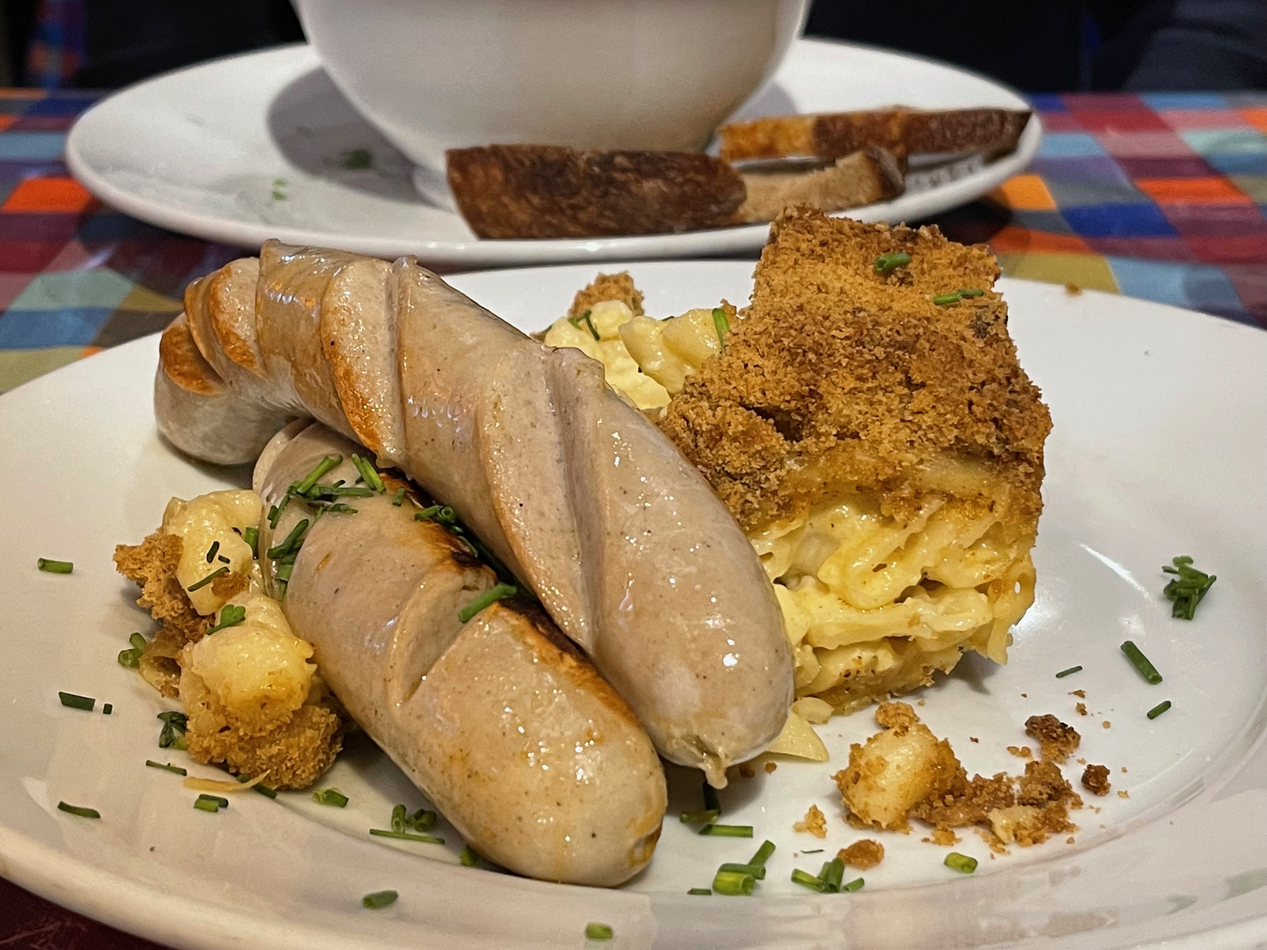 I had bratwurst with dry-ish mac cheese and Grant made the better choice – meatballs in broth.