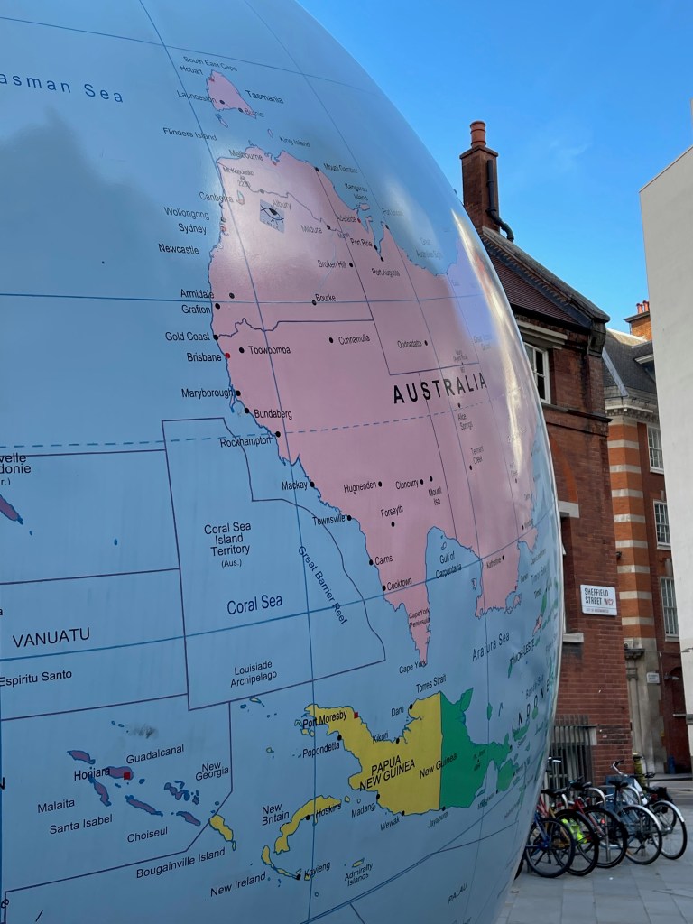 From here we headed back up Fleet Street towards the West End via a detour through the London School of Economics and spent ages talking to a couple from Perth, Australia about the upside-down globe sculpture by Mark Wallinger. #foodforthought
